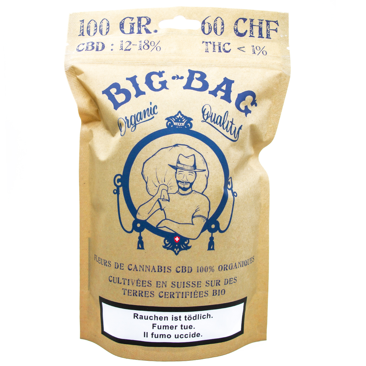 Big Bag 100g organic CBD : fleur outdoor biologique en format XXL à CHF 0.60/g. Qualité organique certifiée, profil naturel et herbacé. Le grand sac pour les gros consommateurs.