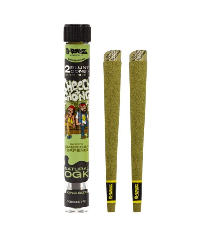 Blunt G-Rollz Natural OGK : deux cônes King Size pré-roulés, infusés aux terpènes naturels, sans tabac ni nicotine, dans un tube en verre hermétique réutilisable.