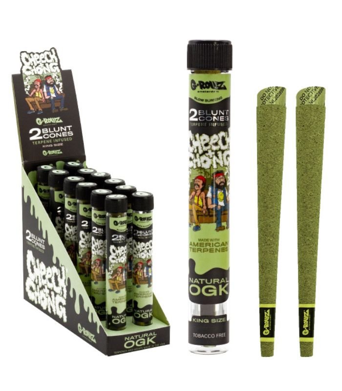 Les G-Rollz Natural OGK proposent un format prêt à l’emploi conçu pour ceux qui veulent simplicité, constance et goût. Chaque tube contient deux blunt cones King Size pré-roulés, à base de feuille végétale naturelle, infusés avec des terpènes terroirs pour restituer un profil aromatique terreux et végétal, typé OG-style — sans tabac, sans nicotine.