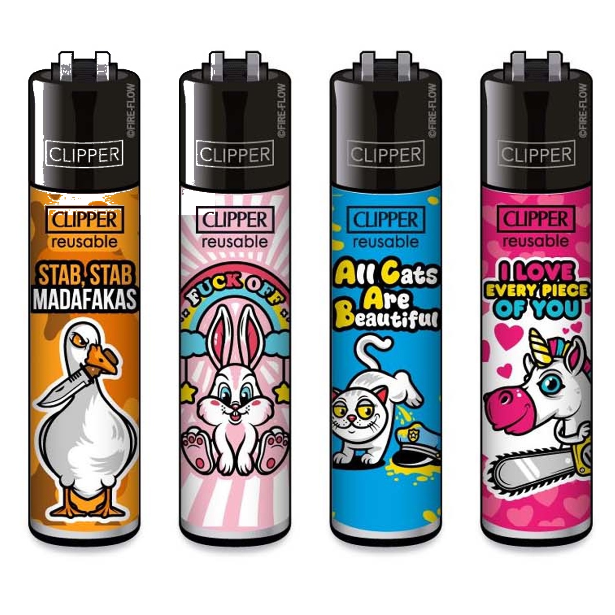 Les Clipper sont vendus par lot de 4 designs différents — chaque lot est une série thématique (motif, couleur, slogan). Parfait pour en offrir, alterner selon l’humeur, ou ne jamais se retrouver sans feu.