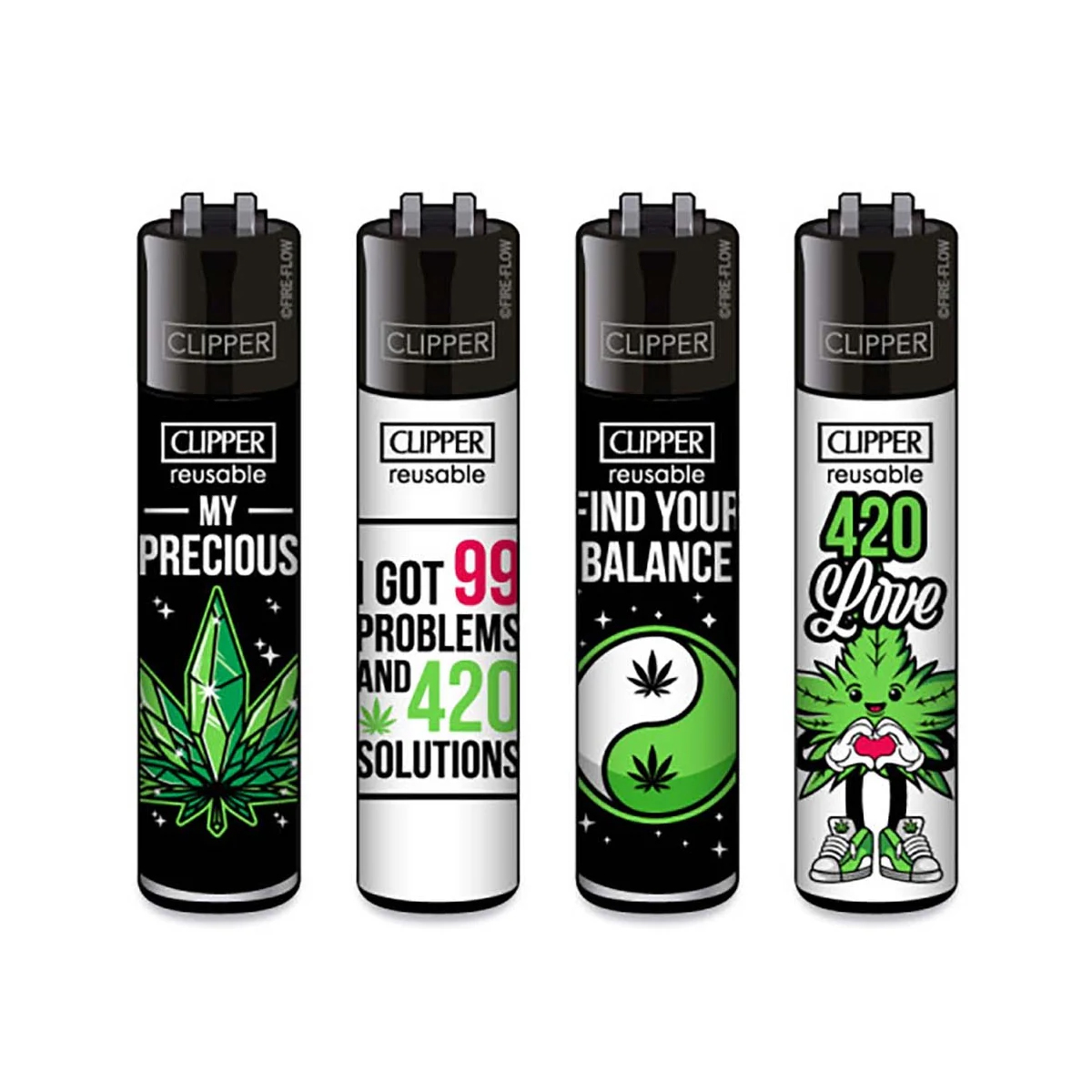 Les Clipper sont vendus par lot de 4 designs différents — chaque lot est une série thématique (motif, couleur, slogan). Parfait pour en offrir, alterner selon l’humeur, ou ne jamais se retrouver sans feu.