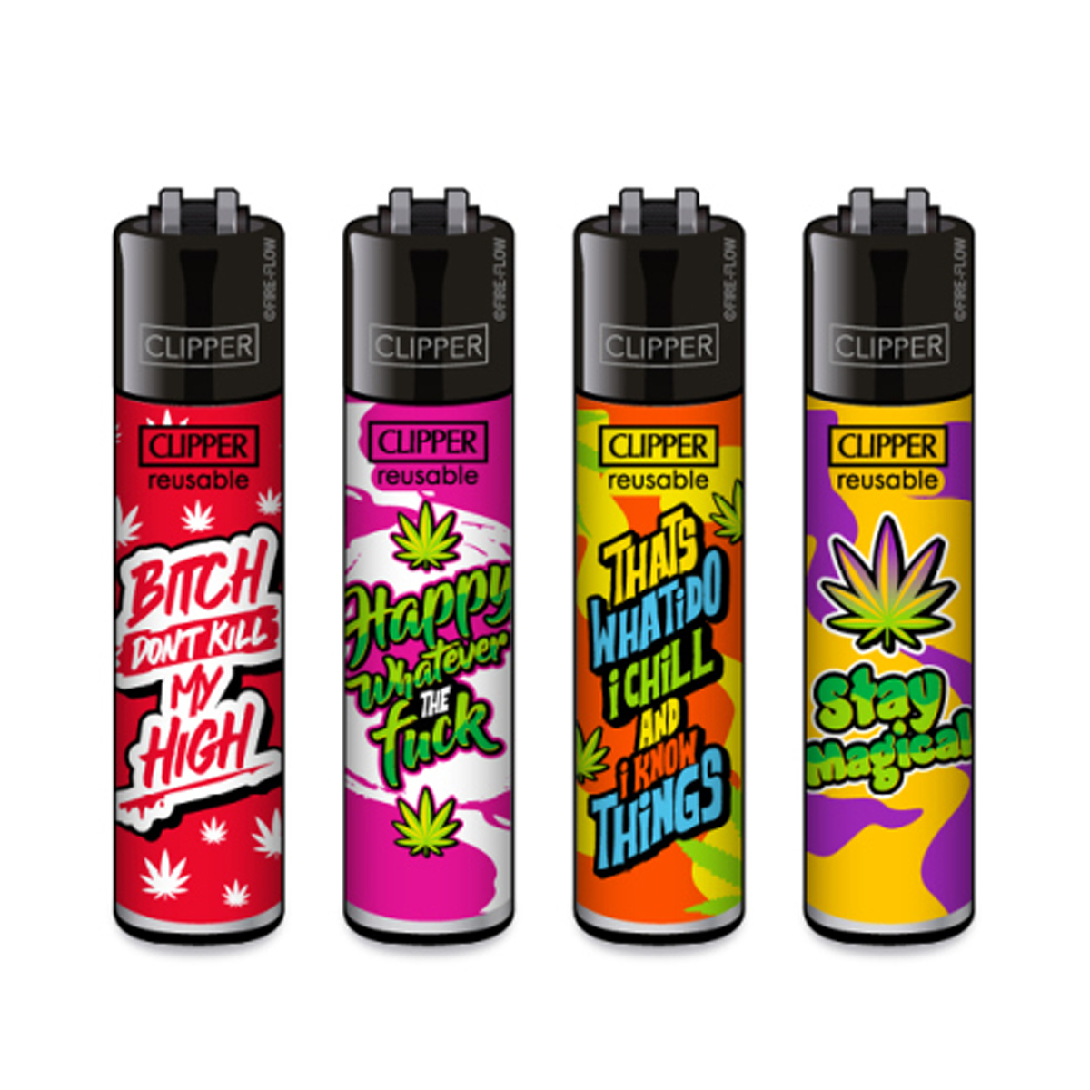 Les Clipper sont vendus par lot de 4 designs différents — chaque lot est une série thématique (motif, couleur, slogan). Parfait pour en offrir, alterner selon l’humeur, ou ne jamais se retrouver sans feu.
