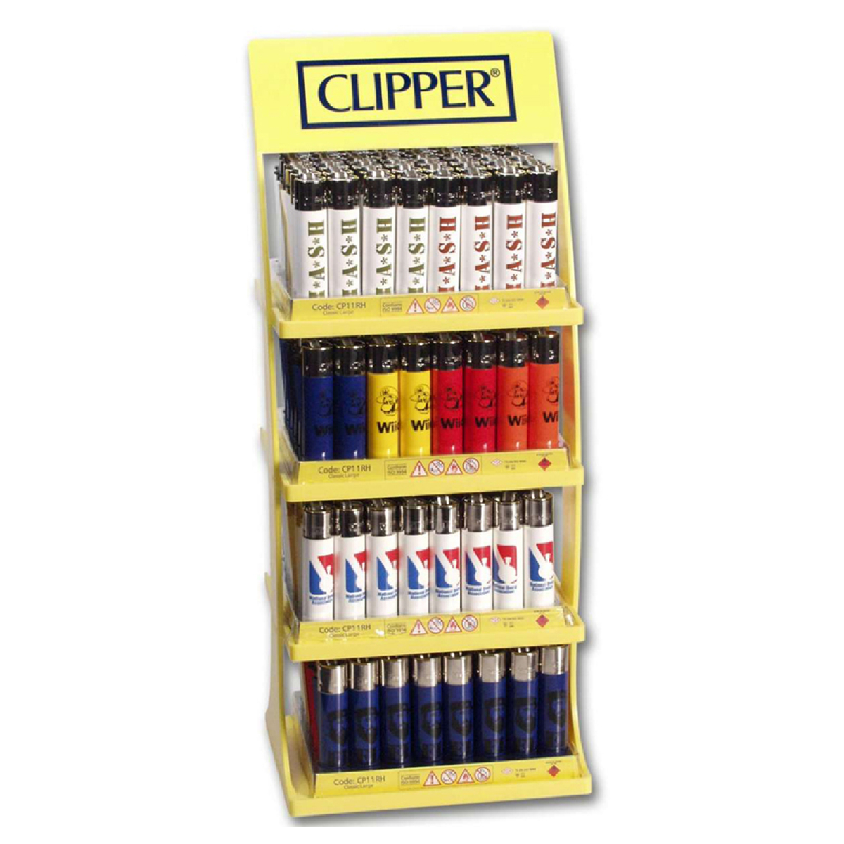 Clipper • Lot de 4 — Présentoir officiel Clipper avec plusieurs briquets prêts à la vente ou à l’utilisation.