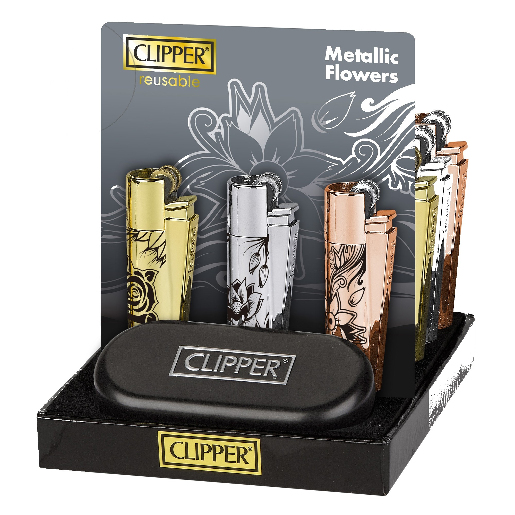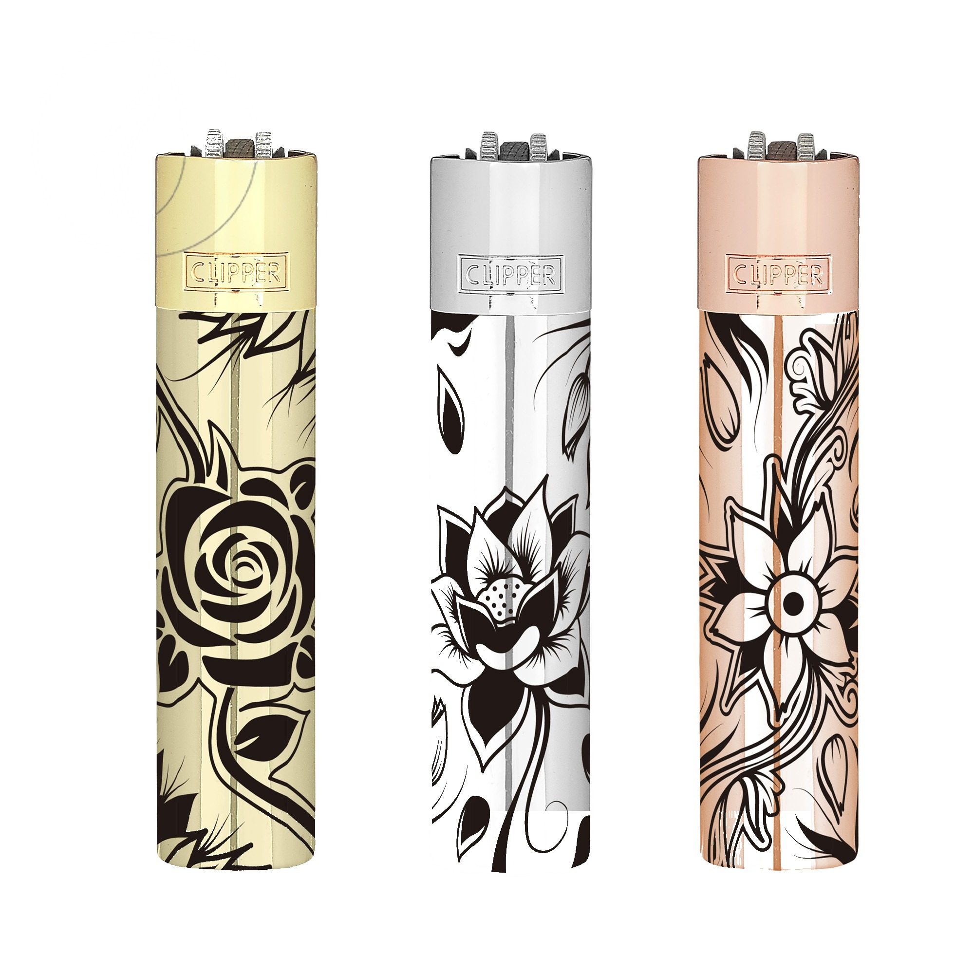 Briquet Clipper Metal Flowers 2 (coloris assorti) — Métal premium rechargeable