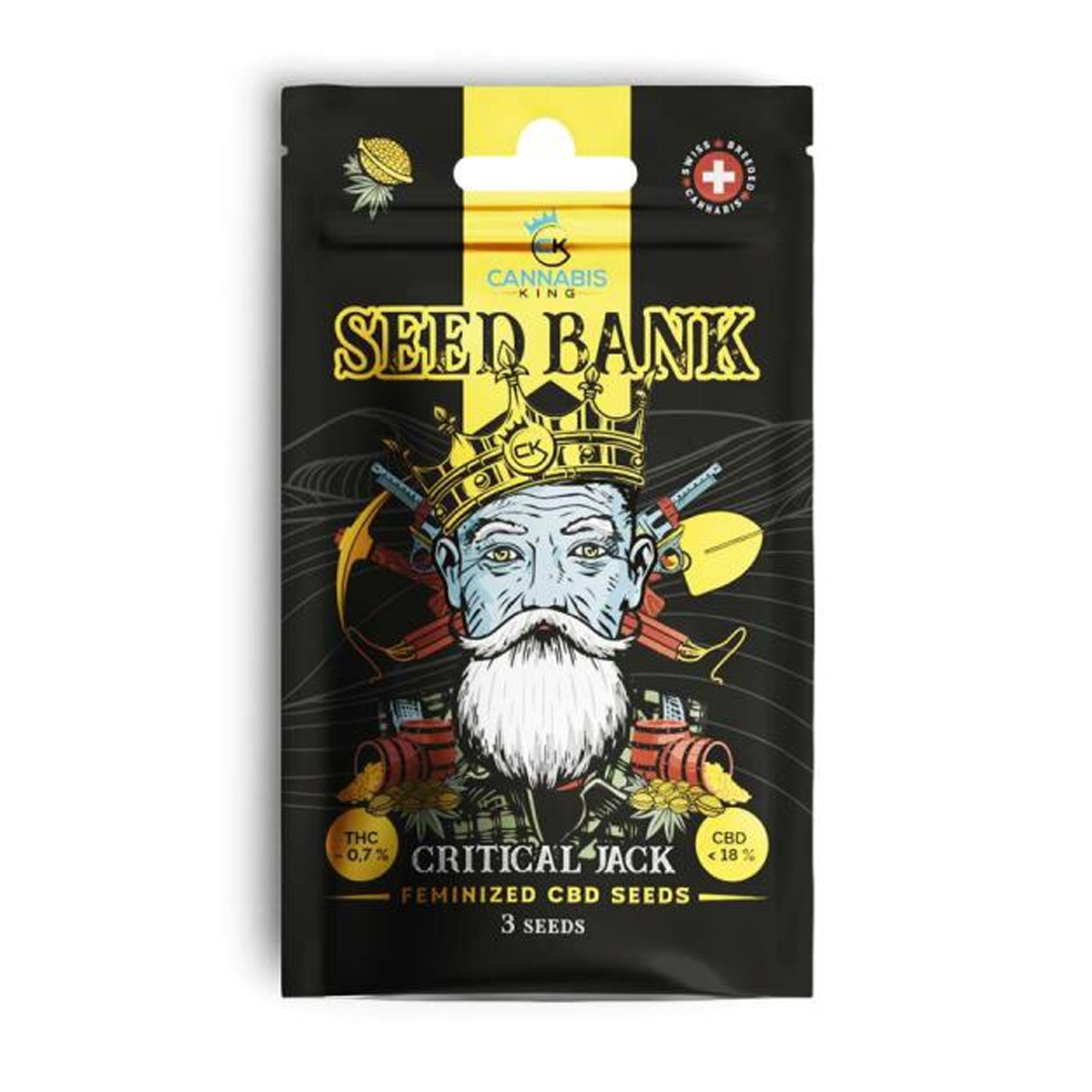 Critical Jack CBD Cannabis King 3 graines — hybride Critical Mass x Jack Herer en version CBD. Rendements massifs, arômes pin et citron. CHF 25.