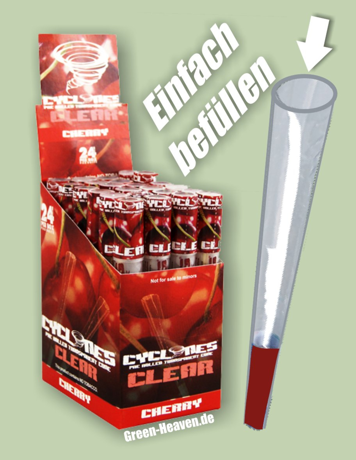Cyclones propose des cônes pré-roulés en cellulose transparente aromatisée. Chaque tube contient 2 cônes prêts à l’emploi avec embout en bois intégré.