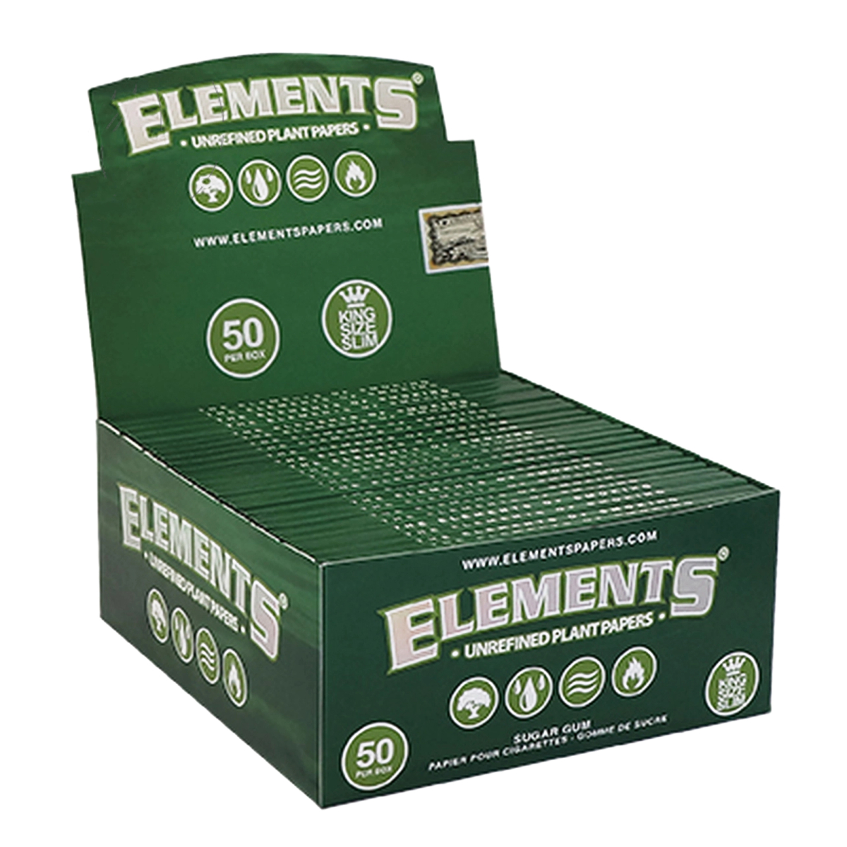 Boîte de 50 cahiers Elements Kingsize Slim Unrefined Plant Papers. Elements est une marque premium de papier à rouler fabriquée à Alcoy, Espagne. Spécialisée dans le papier de riz ultra fin, Elements est connue pour sa combustion quasi invisible et son système de fermeture magnétique innovant.