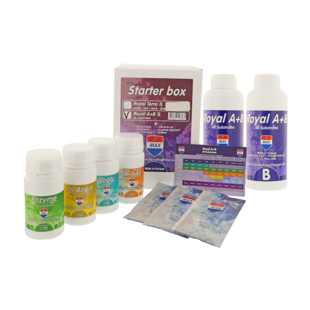 Kit de démarrage F-Max avec l’engrais bi-composant Royal A+B en 1L. Inclut engrais de base, stimulateurs et additifs pour un cycle complet en coco ou hydro. Idéal pour découvrir la gamme F-Max.