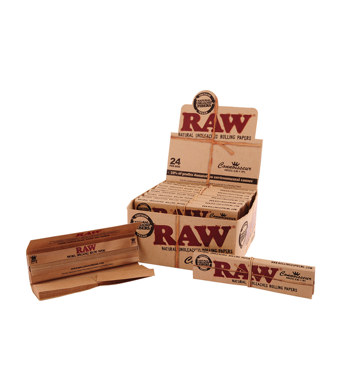 RAW Connoisseur Kingsize Slim : papiers non blanchis + filtres naturels, combustion lente et uniforme. Pack compact, écologique et ultra-pratique. Disponible en boîte économique de 24.