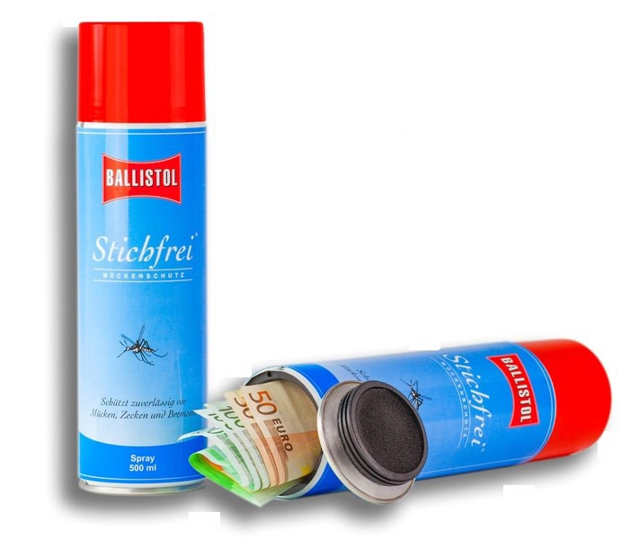 Fuzion Dosentresor Ballistol Stichfrei : objet du quotidien truqué qui dissimule un compartiment caché dans son socle ou son couvercle. Vu de l’extérieur, l’imitation est parfaite — poids, couleur, étiquetage et format identiques au produit original.