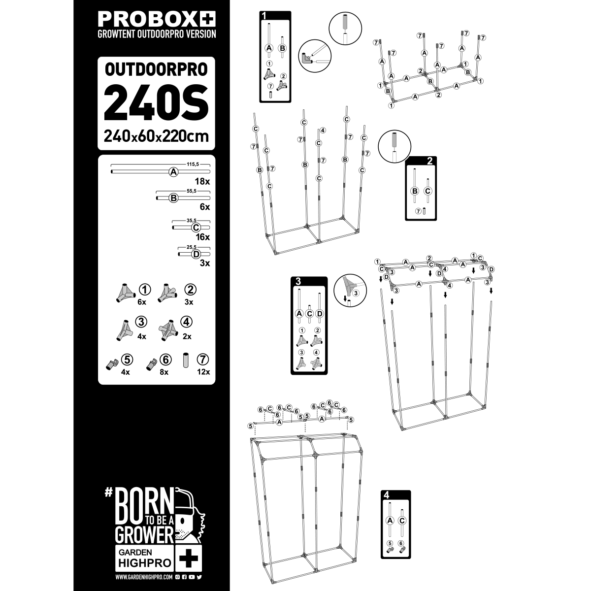 Garden HighPro Outdoorpro 240S : grande tente renforcée 240x120x200cm (2.88m²). Construction robuste pour 8-16 plantes.