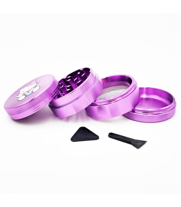Le Hello Kitty Aluminium Grinder Bong Violet 4Parts 50 mm est un broyeur compact conçu pour offrir un broyage uniforme avec un mécanisme fiable. Fabriqué en aluminium anodisé de qualité, il combine robustesse et facilité d’entretien. Sa conception en 4 pièces intègre un tamis à pollen permettant une séparation efficace des particules fines.