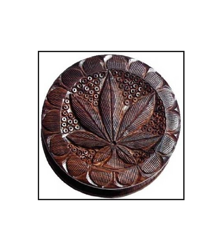 Moulin à bois compact avec dents en clou, décoré d’une feuille de chanvre gravée. Discret, naturel et pratique pour un broyage simple et efficace. Diamètre : 55 mm – Hauteur : 25 mm.
