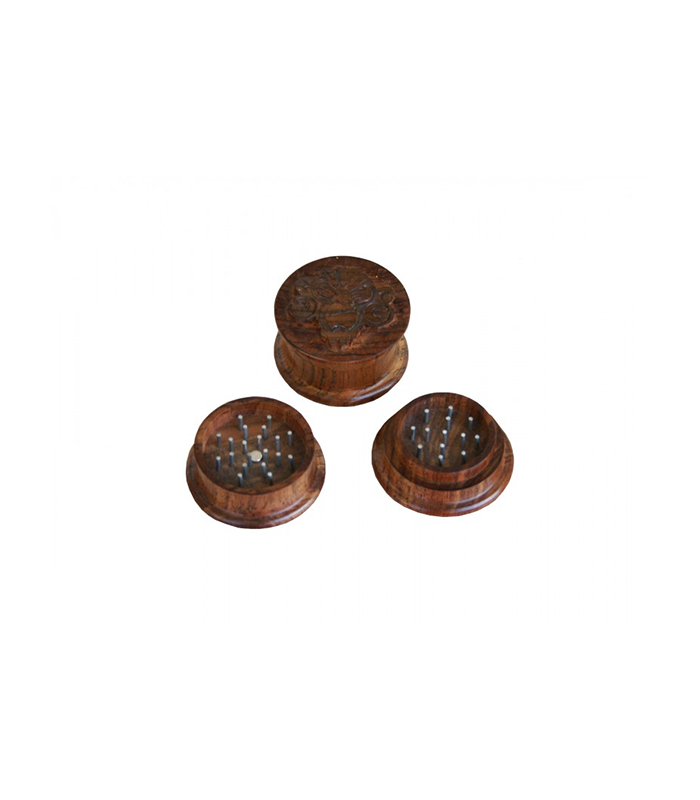 Grinder en bois avec dents en clous, décoré d’un motif Monkey gravé. Compact, discret et idéal pour une mouture naturelle. Diamètre 55 mm – Hauteur 32 mm.