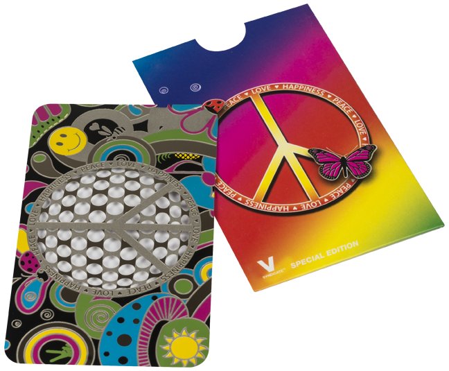 Grinder – V Syndicate Grinder Card – Peace (Color) — grinder card V Syndicate au format carte bancaire (85x50mm). V Syndicate est le créateur de la grinder card originale. En acier chirurgical inoxydable avec revêtement antiadhésif et trous découpés au laser. Les dents sont assez tranchantes pour broyer n’importe quelle herbe mais conçues pour ne pas blesser les doigts. Se glisse dans un portefeuille. Chaque modèle a un design artistique exclusif. Se nettoie d’un coup de chiffon humide.