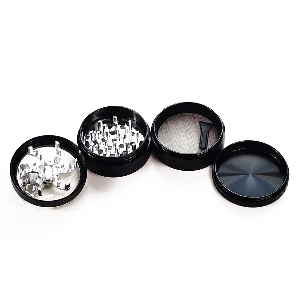 Format 4 parties : couvercle, chambre de broyage, tamis et récupérateur de pollen. Le tamis filtre les trichomes qui se déposent dans le compartiment du fond.