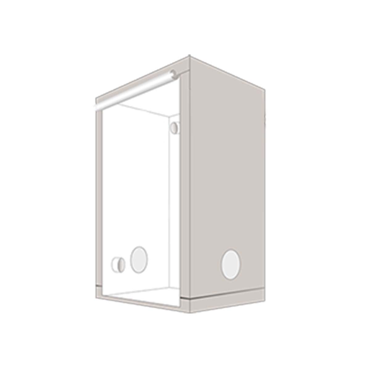 Montage rapide sans outils grâce au système de connecteurs enfichables Homebox. Assembler le châssis, enfiler la toile et fermer les zips. Prévoir un extracteur 100-125 mm avec filtre à charbon pour la ventilation. Format idéal pour 1-2 lampes LED de 100-200W ou une HPS 250W.