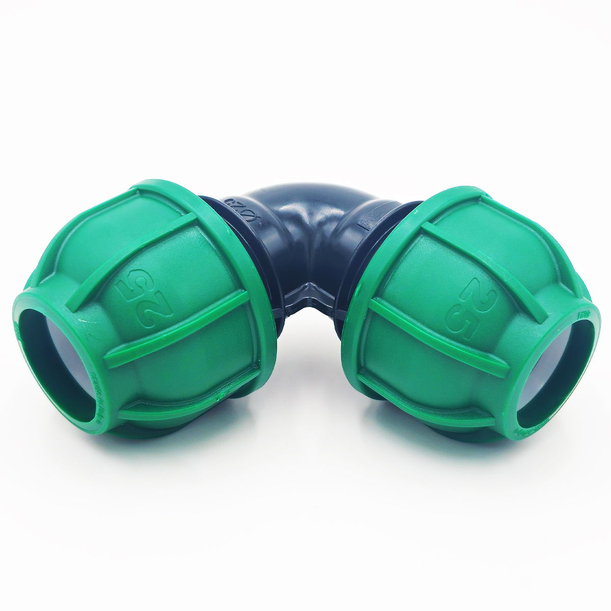 Coude 90° Irritec PP Green 25mm. Changement de direction pour tuyaux PE 25mm dans les circuits d’irrigation.