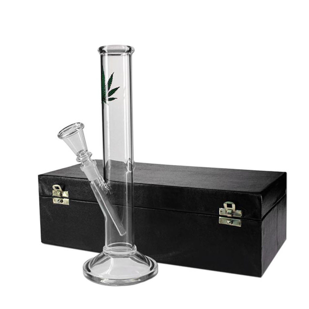 Black Leaf propose un excellent rapport qualité-prix sur tout le spectre du bong en verre : du modèle d’initiation au bong percolé multi-étages. Le Kofferbong Hanfblatt Zylinder bénéficie d’un verre borosilicate solide et d’une fabrication soignée.