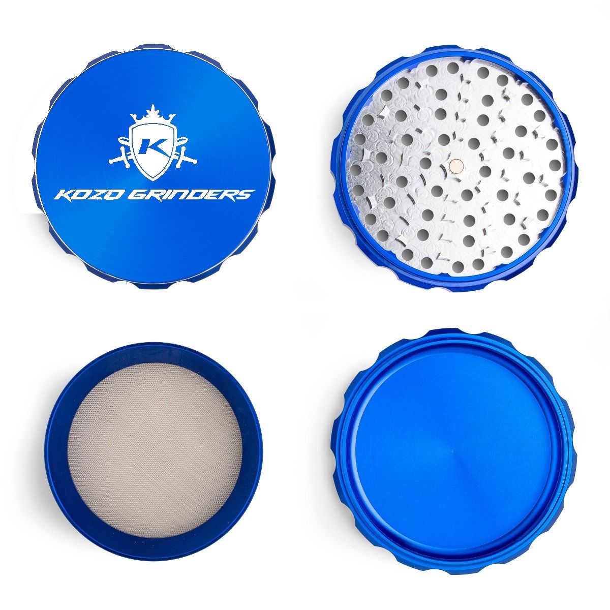KOZO Grinder Blue 4 Parts 101mm — KOZO : aluminium 6061 CNC monobloc, 4 parties, aimants néodyme N52. Qualité d’usinage premium à prix juste.