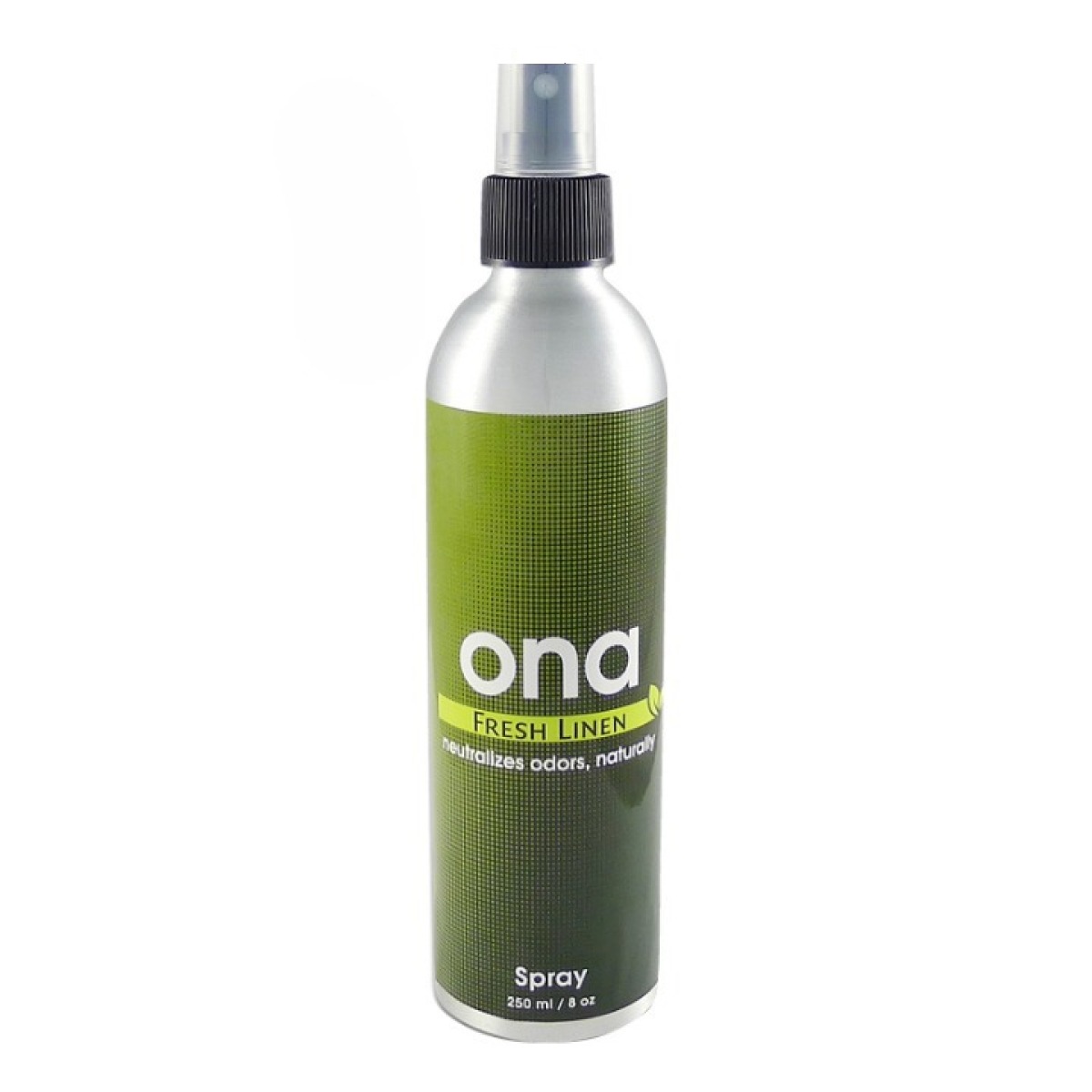 ONA Spray Fresh Linen 250ml – neutralisateur instantané. Ø50 × H200 mm, 300 g. Parfum fraîche de linge propre. Neutralise, ne masque pas.
