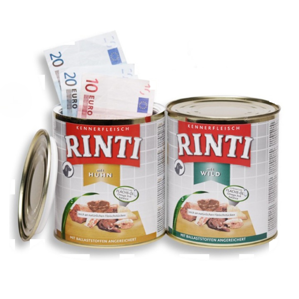 Plastic Fantastic Rinti – Dosenhundefutter avec Huhn : objet du quotidien truqué qui dissimule un compartiment caché dans son socle ou son couvercle. Vu de l’extérieur, l’imitation est parfaite — poids, couleur, étiquetage et format identiques au produit original.