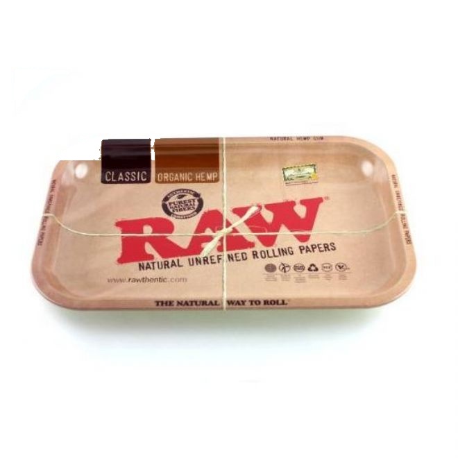 Plateau à rouler – RAW Rolling Tray S 125 x 180mm — Plateau à rouler RAW officiel : métal embossé, logo RAW iconique, finition naturelle marron. La référence authentique des rolling papers.