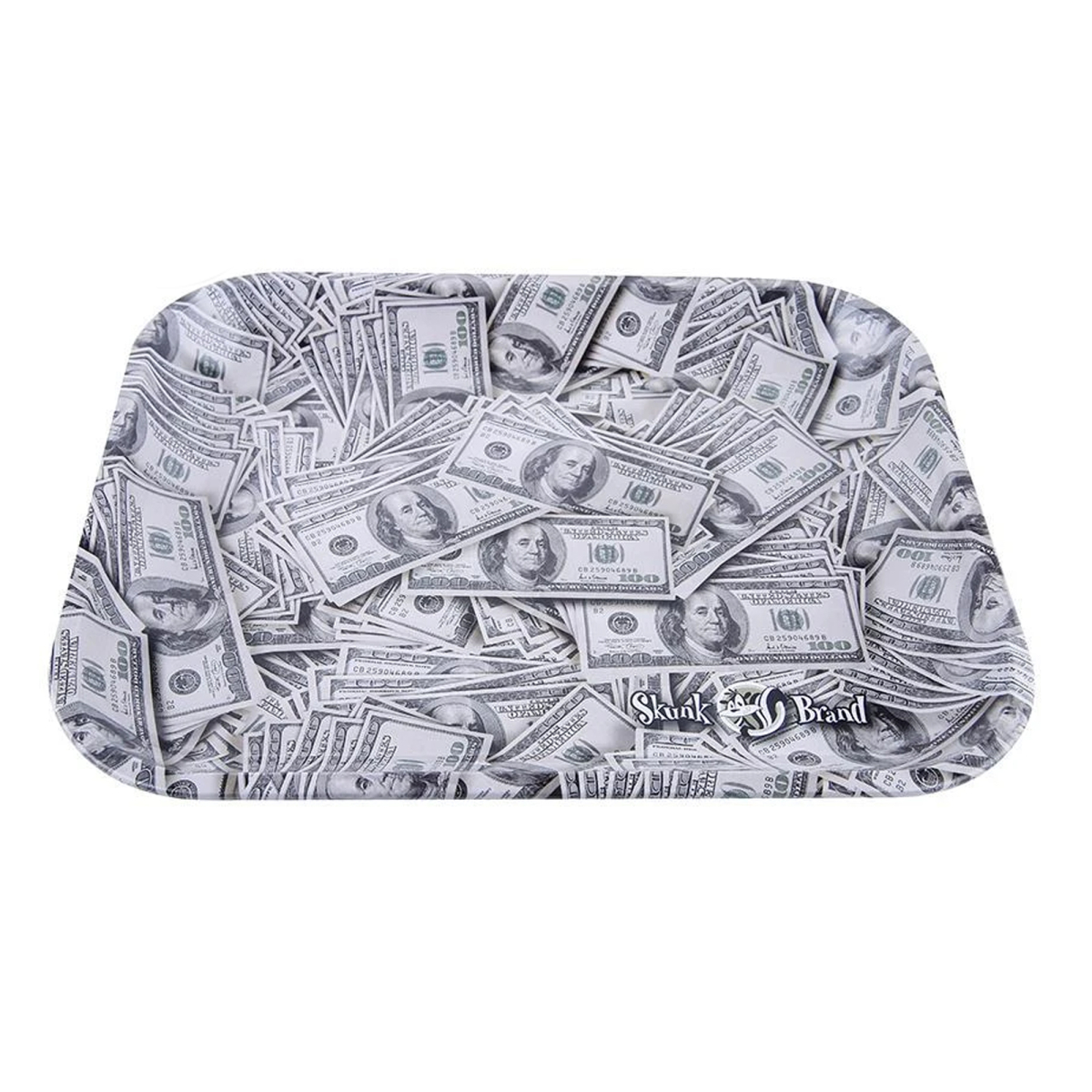 Plateau à rouler – Skunk Brand Rolling Tray Cash 275 x 340mm — Plateau à rouler Skunk Brand en métal émaillé. Bords arrondis, impression haute définition, nettoyage facile.