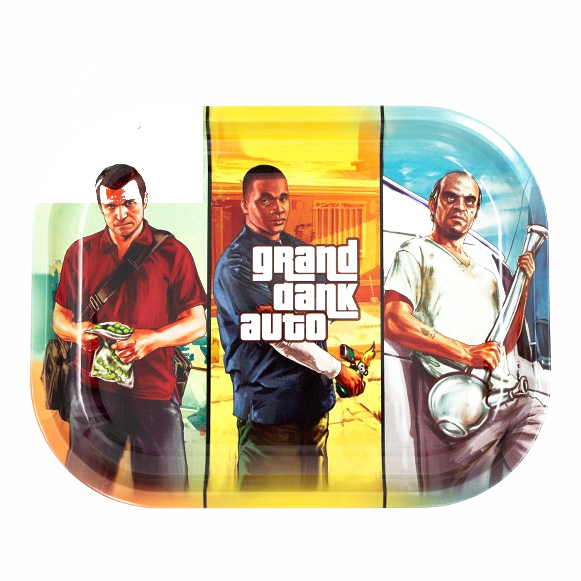 Plateau à rouler – V-Syndicate Rolling Tray S Grand Dank Auto 140 x 180 mm — Plateau à rouler V Syndicate, signé par la marque américaine référence du lifestyle cannabis. Métal émaillé haute qualité, bords arrondis, design coloré imprimé en haute définition. Le compagnon indispensable pour rouler proprement sans perdre un gramme.