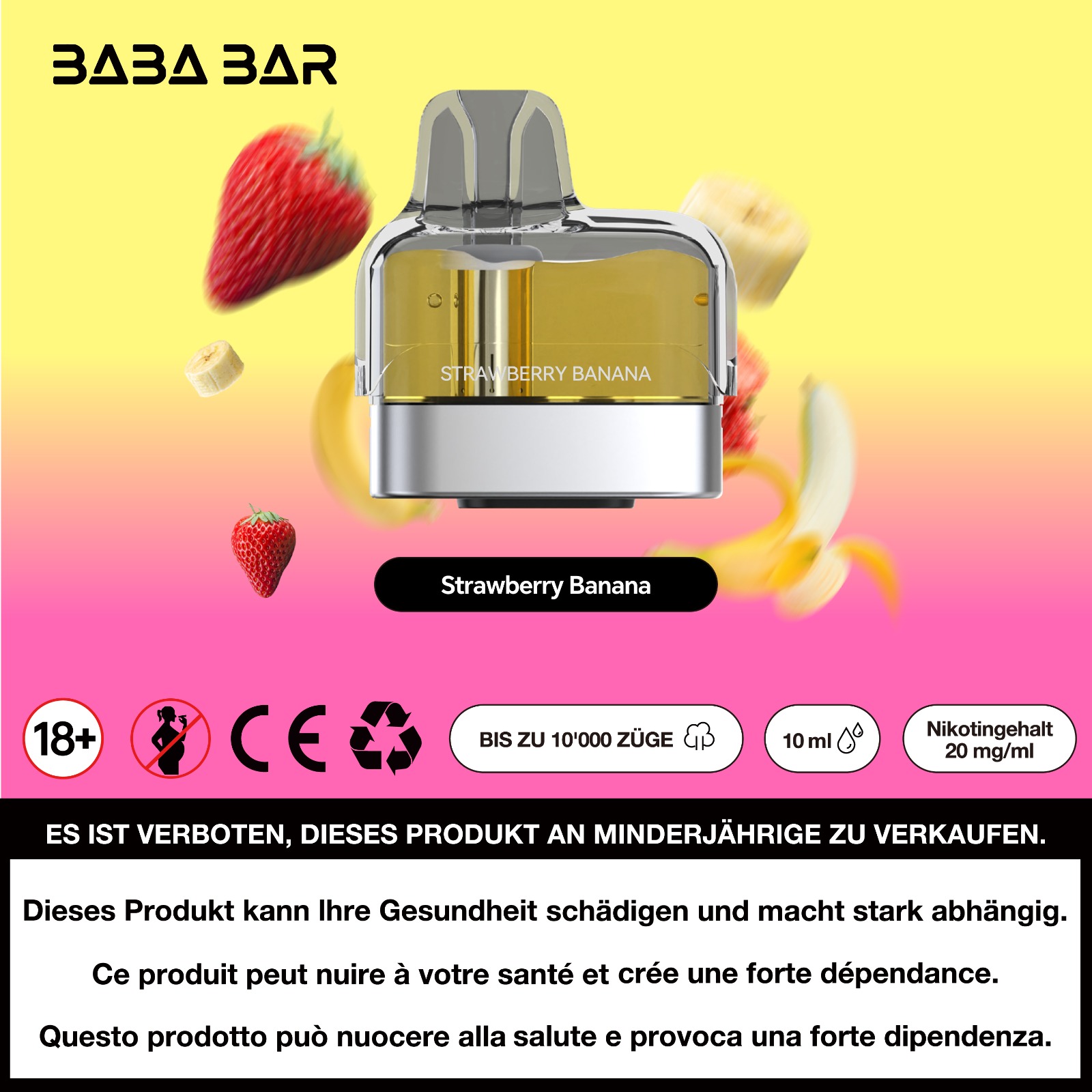 Pod Baba Bar Erdbeere, Banane 10ml en 20mg/ml, compatible avec le Baba Bar Device. Saveur fruitée et utilisation simple.