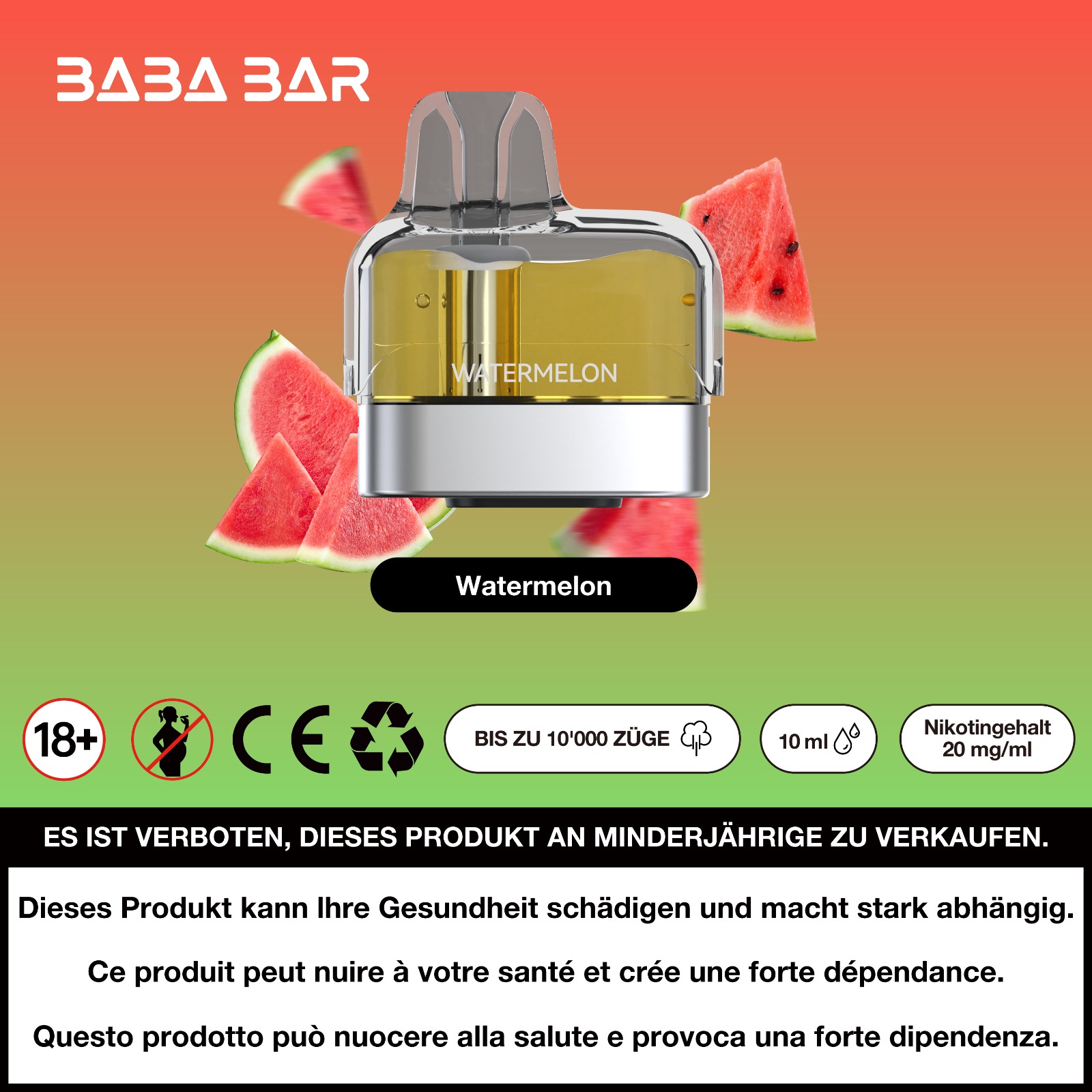Pod Baba Bar Watermelon 10ml en 20mg/ml, compatible avec le Baba Bar Device. Saveur fruitée et utilisation simple.