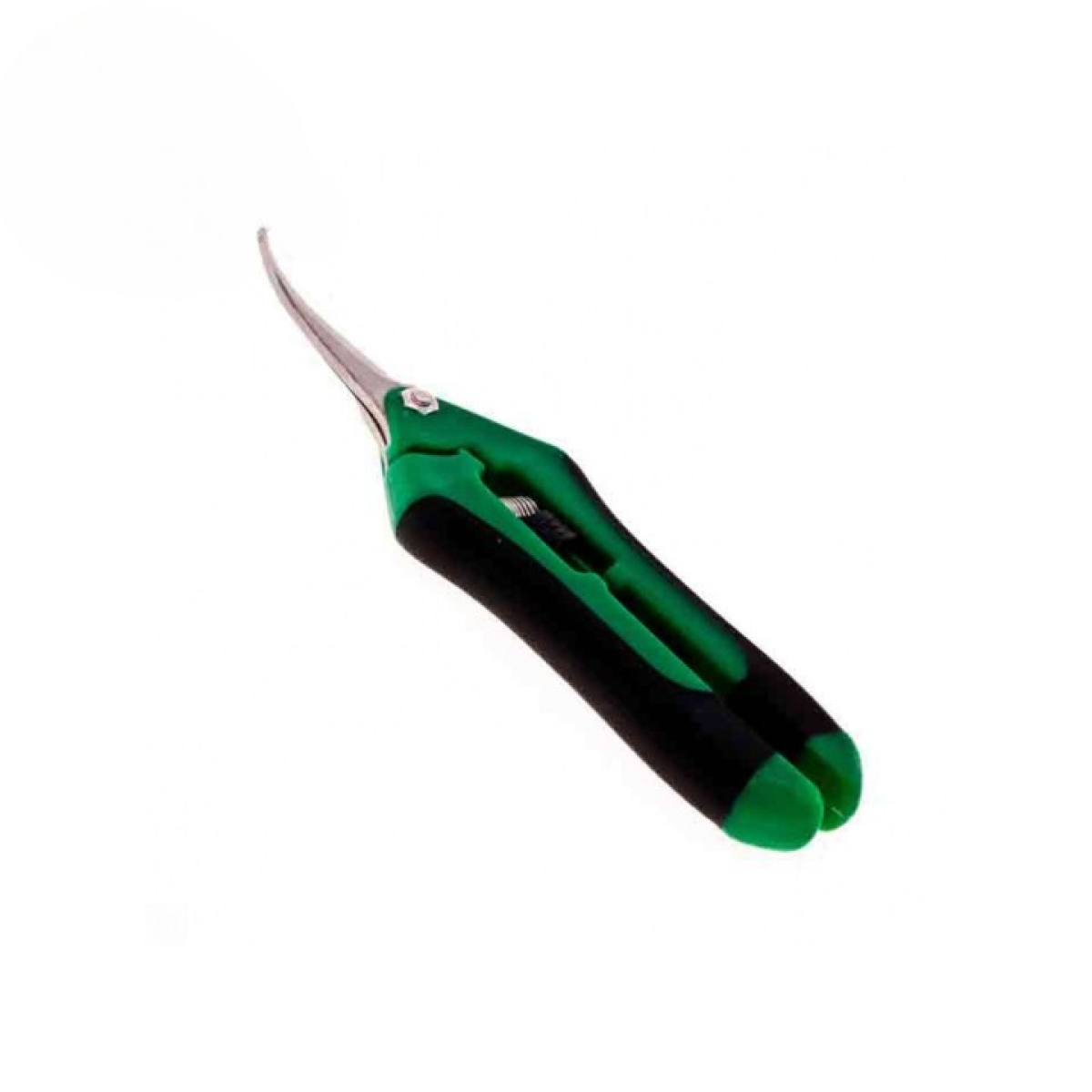 Ciseau d’effeuillage Pure Factory avec lames courbes en acier inoxydable. La forme courbe facilite la coupe autour des fleurs pour un effeuillage plus naturel.