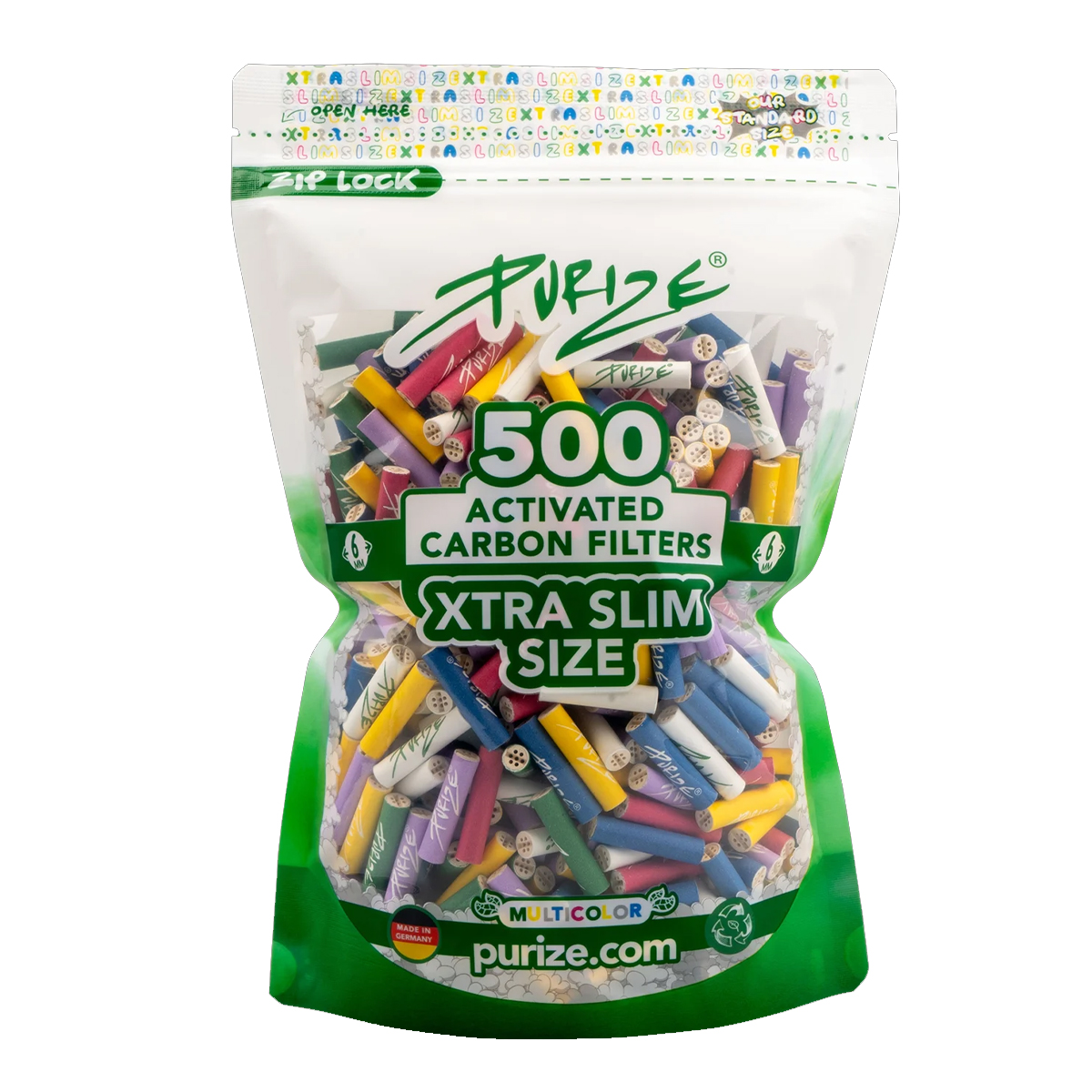 Purize Xtra-Slim 500er Pack Multicolor – charbon actif, slim. Disponible chez GrowTech, livraison rapide en Suisse.