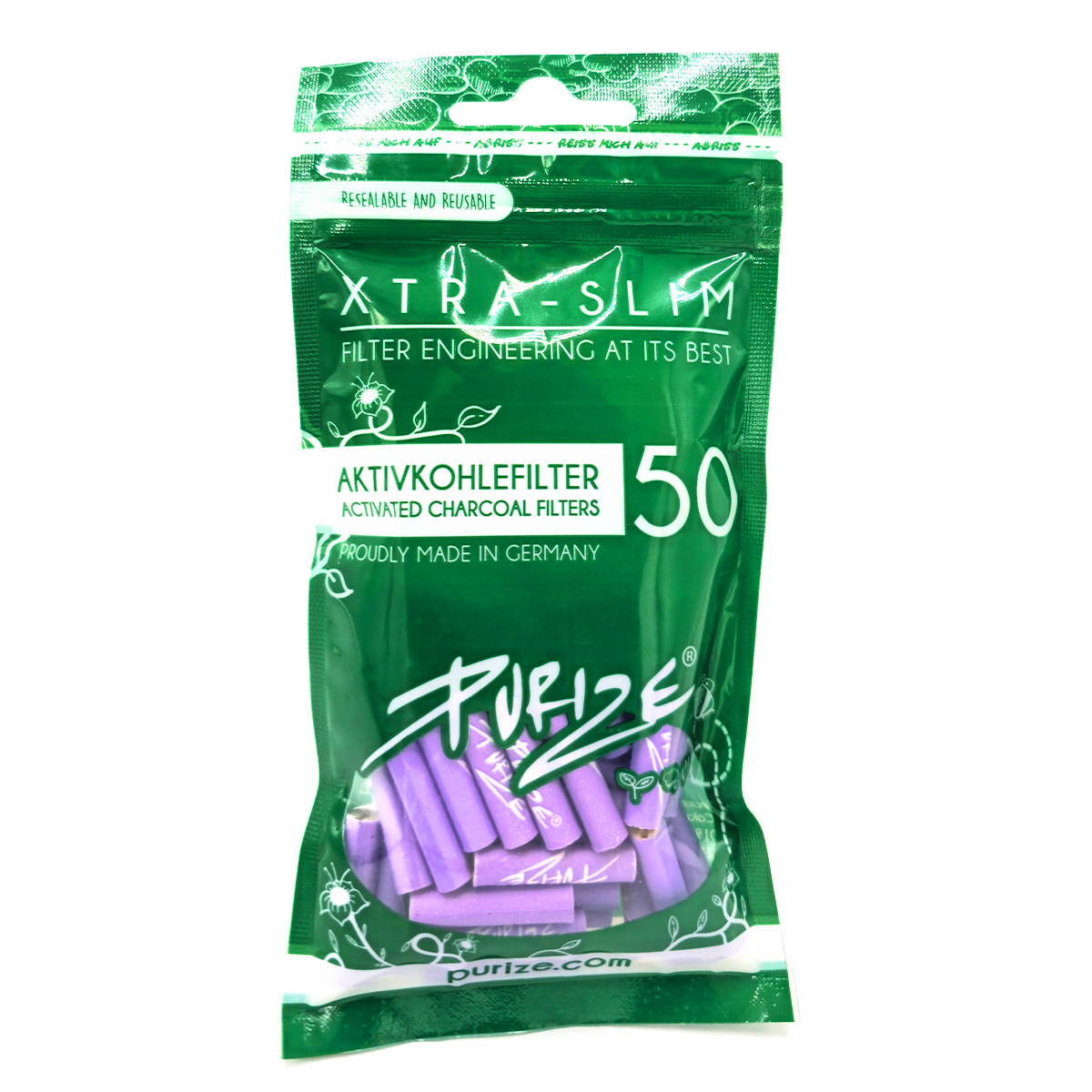 Purize Xtra-Slim 50er Pack Lilac – charbon actif, slim. Disponible chez GrowTech, livraison rapide en Suisse.