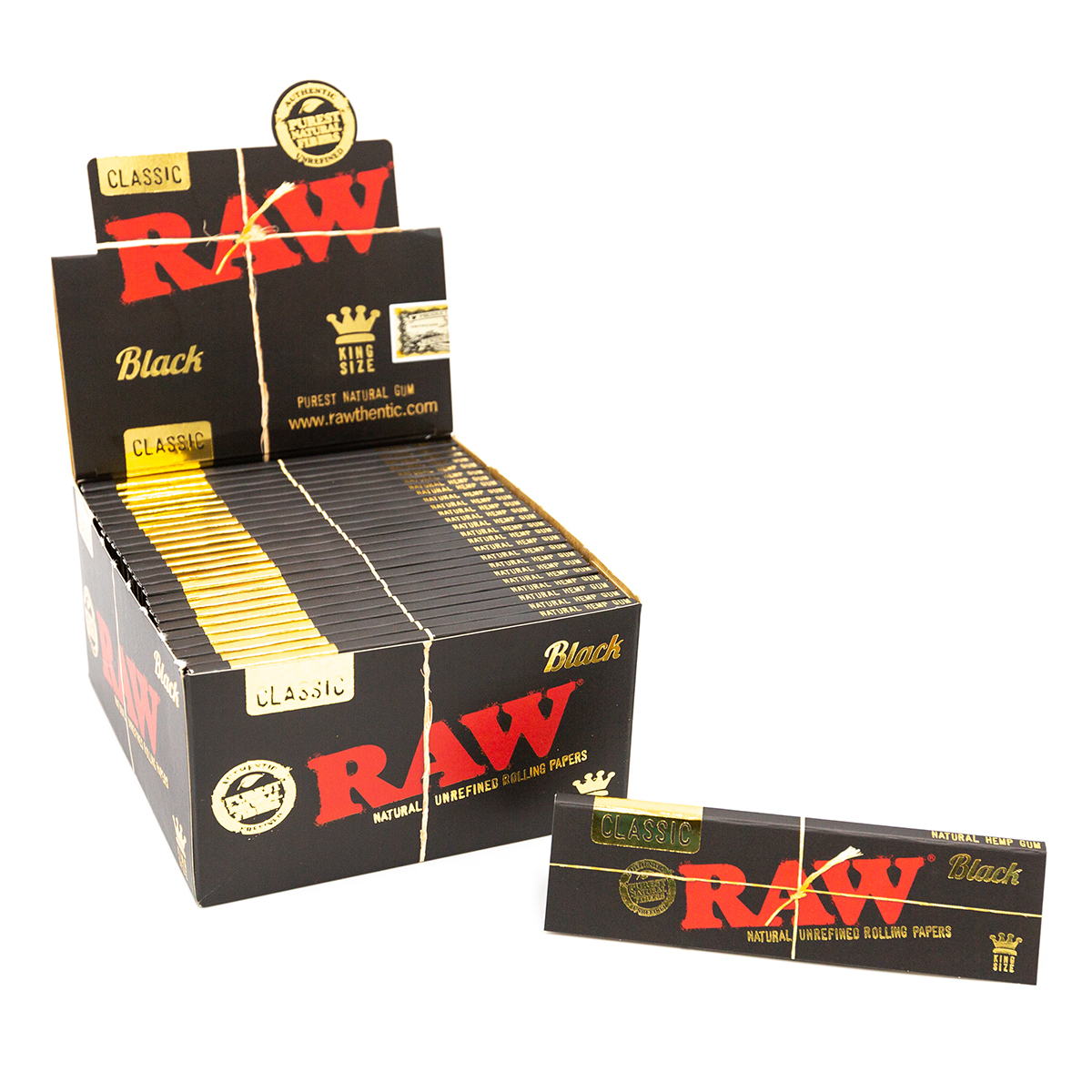 Boîte de 50 cahiers RAW Black Classic King Size Extra Fine. RAW est la marque de référence mondiale pour les feuilles à rouler naturelles. Fondée par Josh Kesselman, RAW produit des papiers non raffinés, non blanchis, fabriqués à Alcoy en Espagne, berceau historique de la fabrication de papier à rouler.
