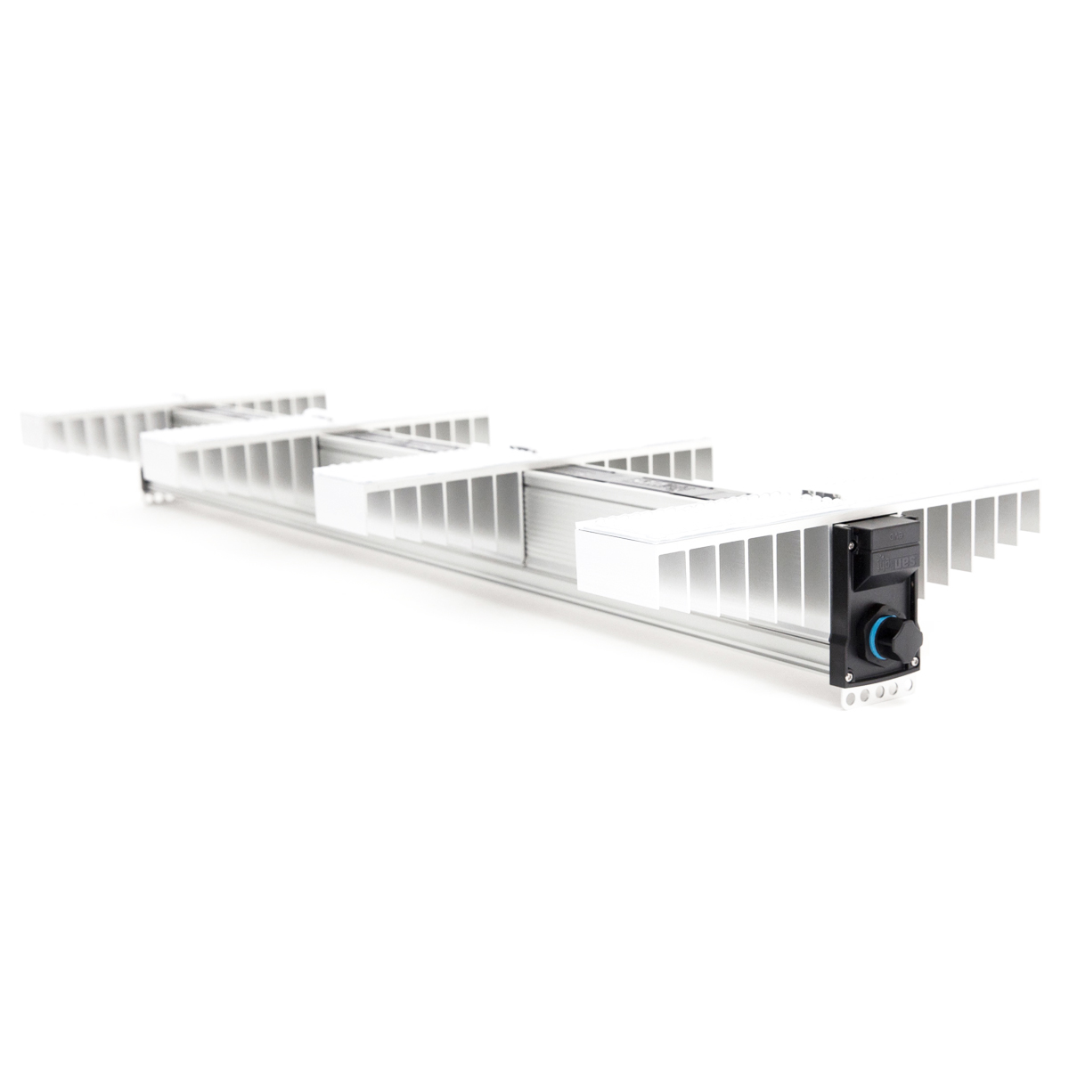Le Sanlight EVO 4-120 offre 265W et 725 µmol/s dans un format allongé de 4 barres sur 120cm. Avec ses dimensions de 1018 × 291 × 116mm et un poids de seulement 5.1 kg, il est conçu pour les espaces rectangulaires et les tentes de 120cm de profondeur. Fonction d’inclinaison ajustable jusqu’à 11° pour un ciblage lumineux précis.