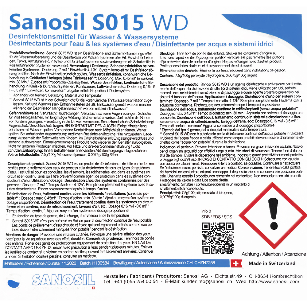 Sanosil S015 WD est un désinfectant professionnel suisse à base de peroxyde d’hydrogène stabilisé par des ions d’argent. Cette technologie dual-action élimine efficacement les biofilms, algues, bactéries et champignons dans les systèmes d’irrigation, les réservoirs et les canalisations, assurant une eau d’arrosage parfaitement propre.
