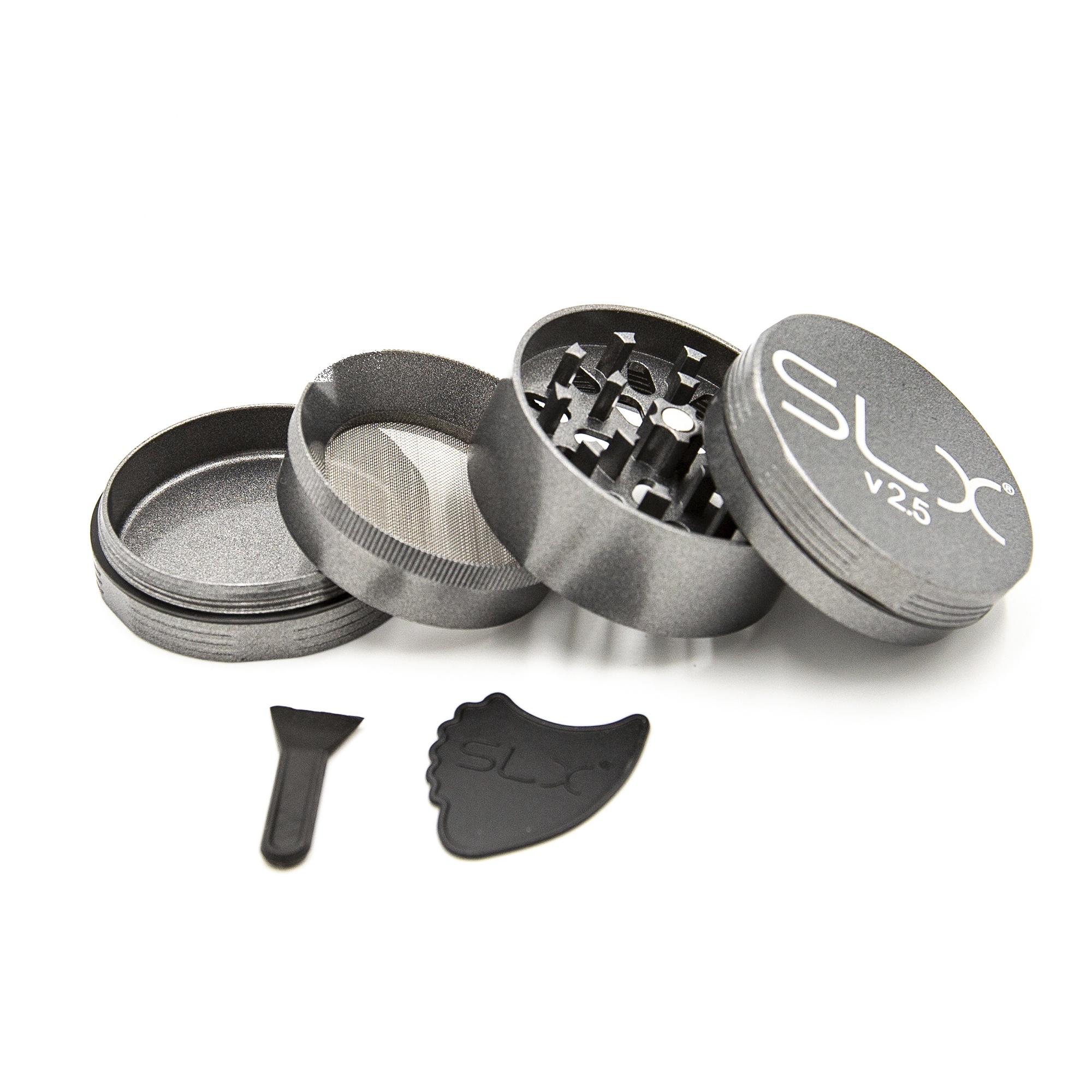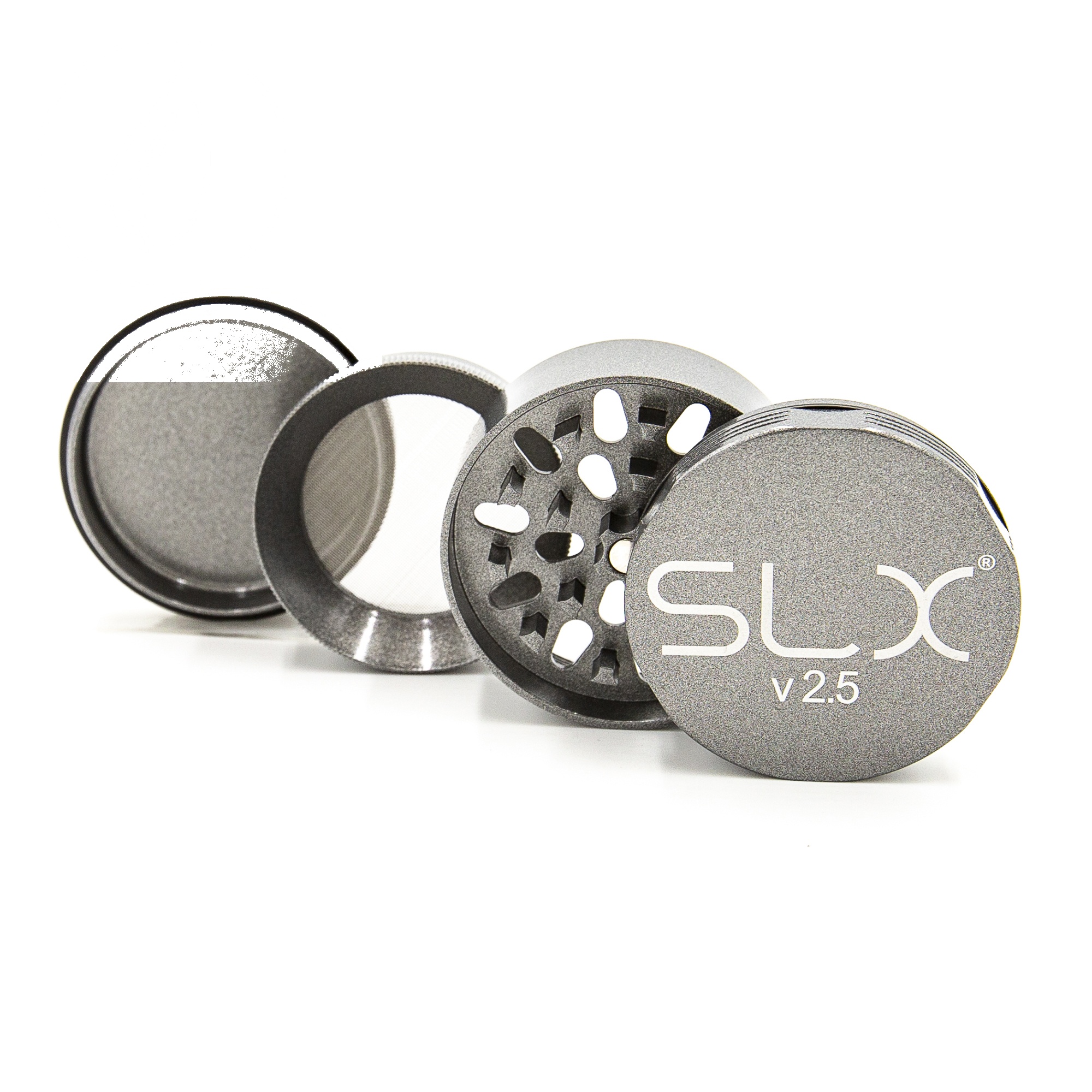 SLX Grinder V2.5 Silver 50mm — SLX V2.5 : revêtement céramique anti-adhésif FDA breveté. Aluminium 7075, pollen et résine ne collent jamais. Garantie à vie.