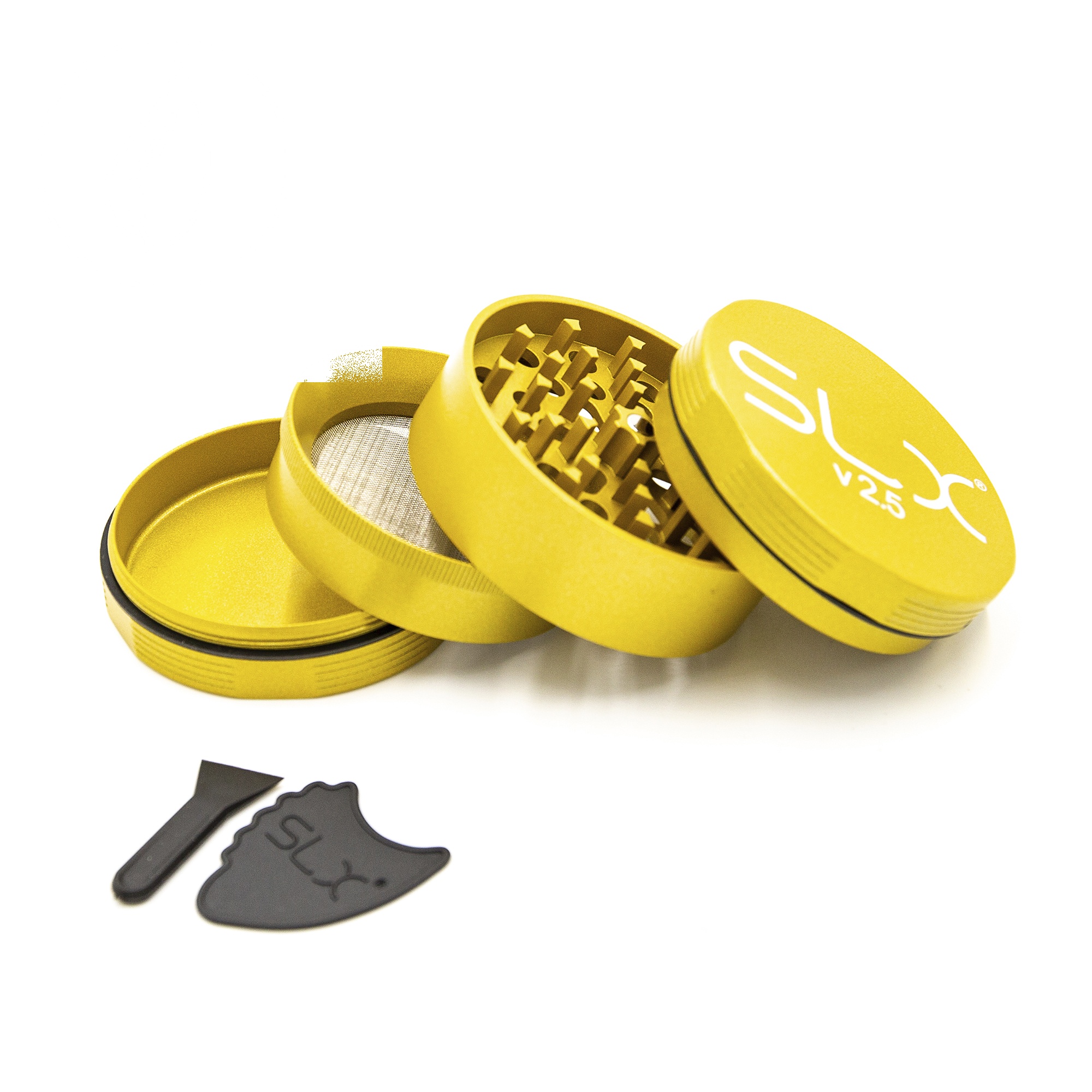 SLX Grinder V2.5 Yellow Gold 50mm — Le grinder révolutionnaire qui a transformé le marché. SLX V2.5 est le seul grinder au monde avec un revêtement céramique anti-adhésif breveté — résine, pollen et herbes ne collent jamais. Plus besoin de nettoyer, plus de résine perdue.
