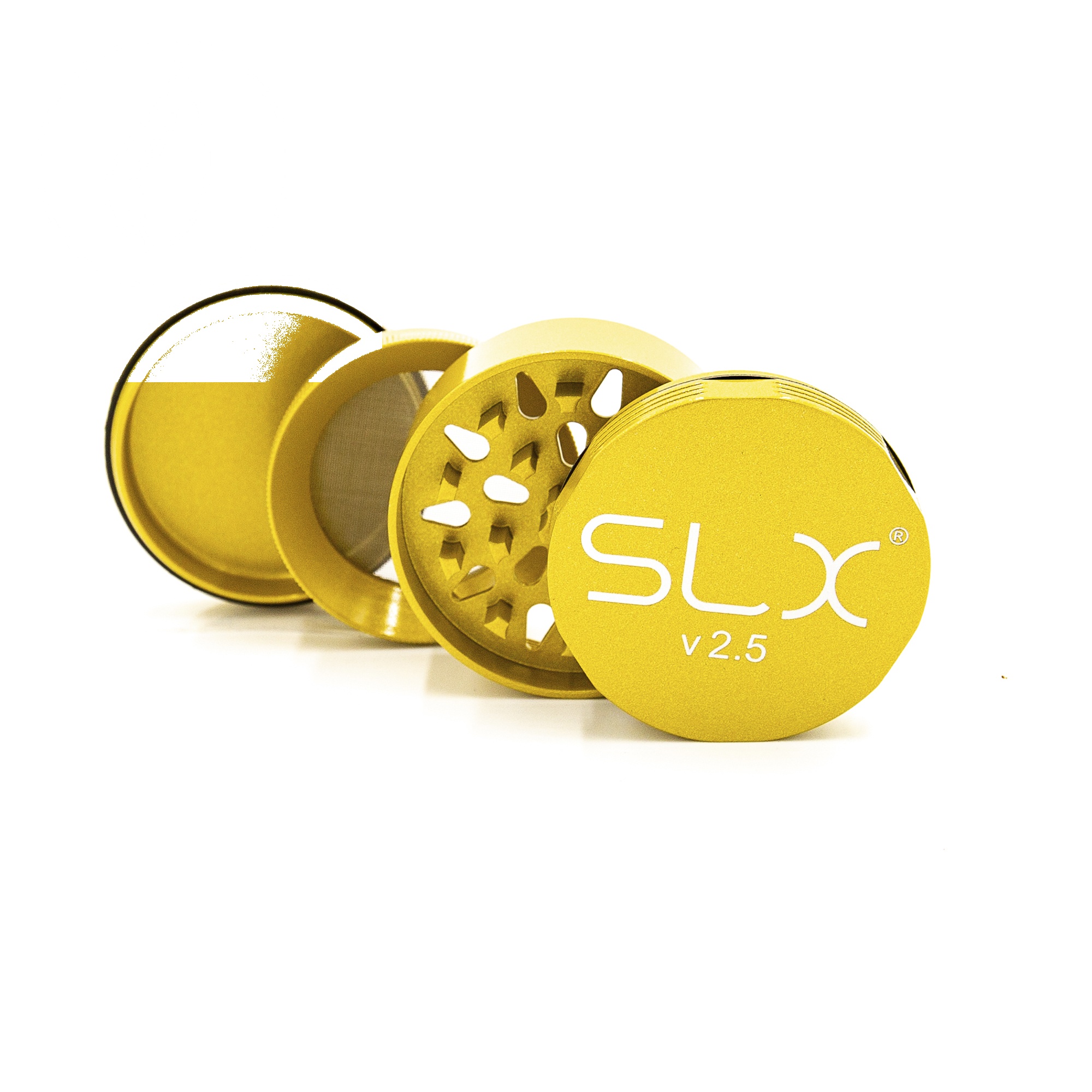 SLX Grinder V2.5 Yellow Gold 62mm — Le grinder révolutionnaire qui a transformé le marché. SLX V2.5 est le seul grinder au monde avec un revêtement céramique anti-adhésif breveté — résine, pollen et herbes ne collent jamais. Plus besoin de nettoyer, plus de résine perdue.