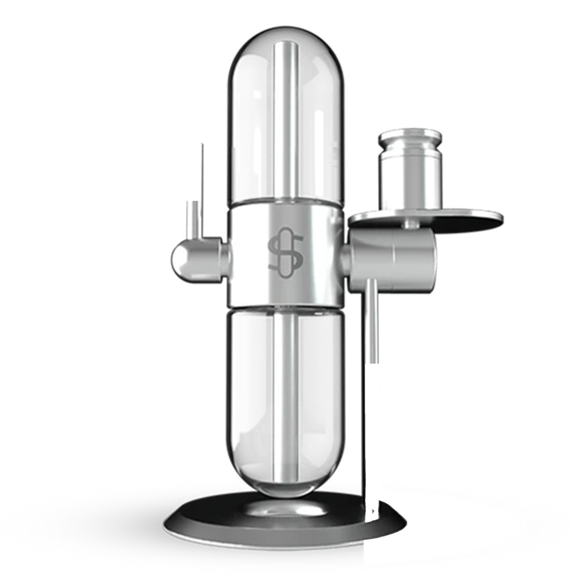 Le Stündenglass exploite la gravité 360° pour générer la fumée sans aucune aspiration manuelle. En tournant la base, l’eau se déverse d’un globe à l’autre. Cette descente d’eau crée une dépression qui aspire la fumée à travers le bowl, traverse l’eau et remplit le globe supérieur. Vous tirez ensuite via le tube : la vapeur, déjà filtrée et fraîche, vous parvient avec une densité que les bongs classiques n’égalent pas.