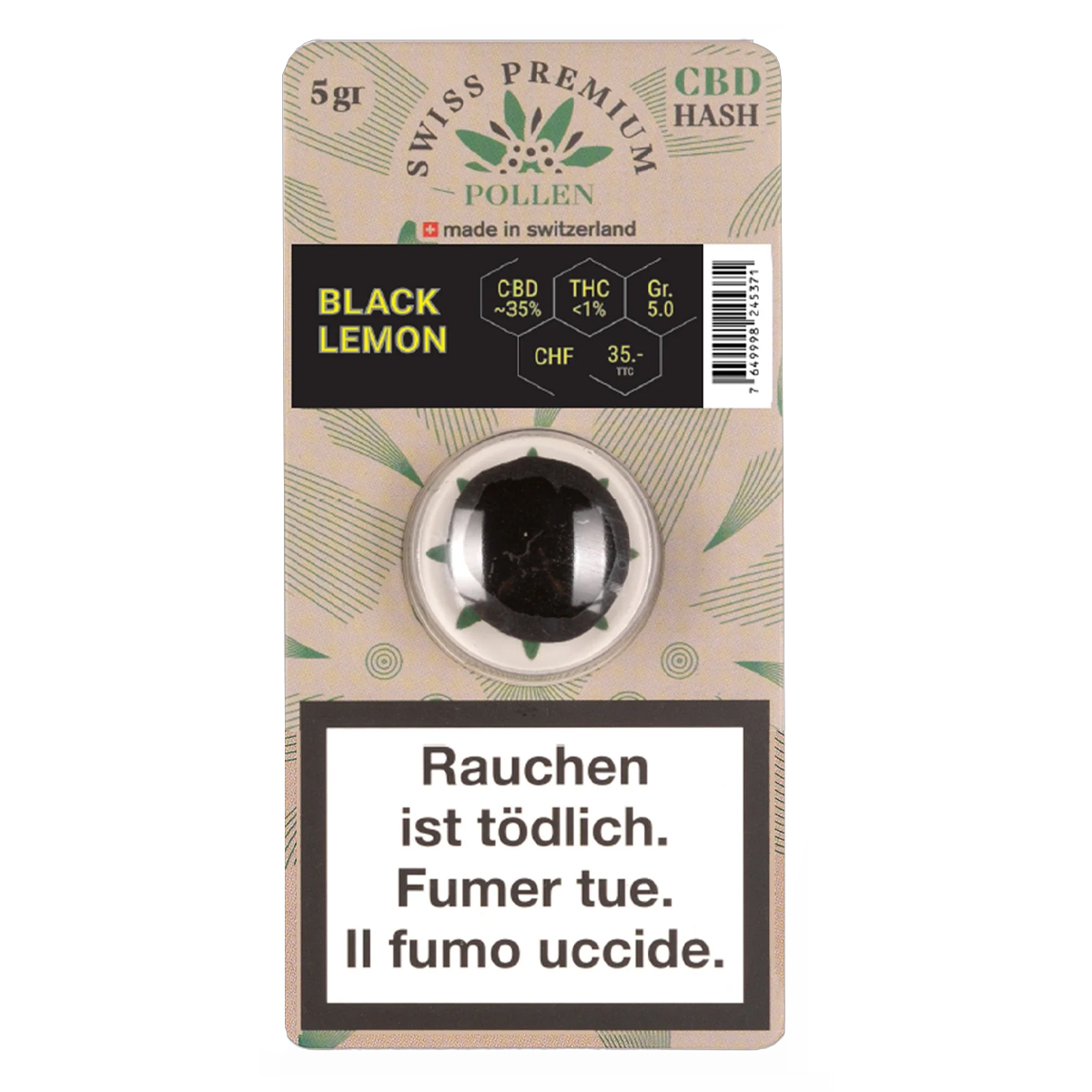 Pollen CBD Black Lemon Edition 5g par Swiss Premium. Notes citronnées intenses sur une base hash noire onctueuse.
