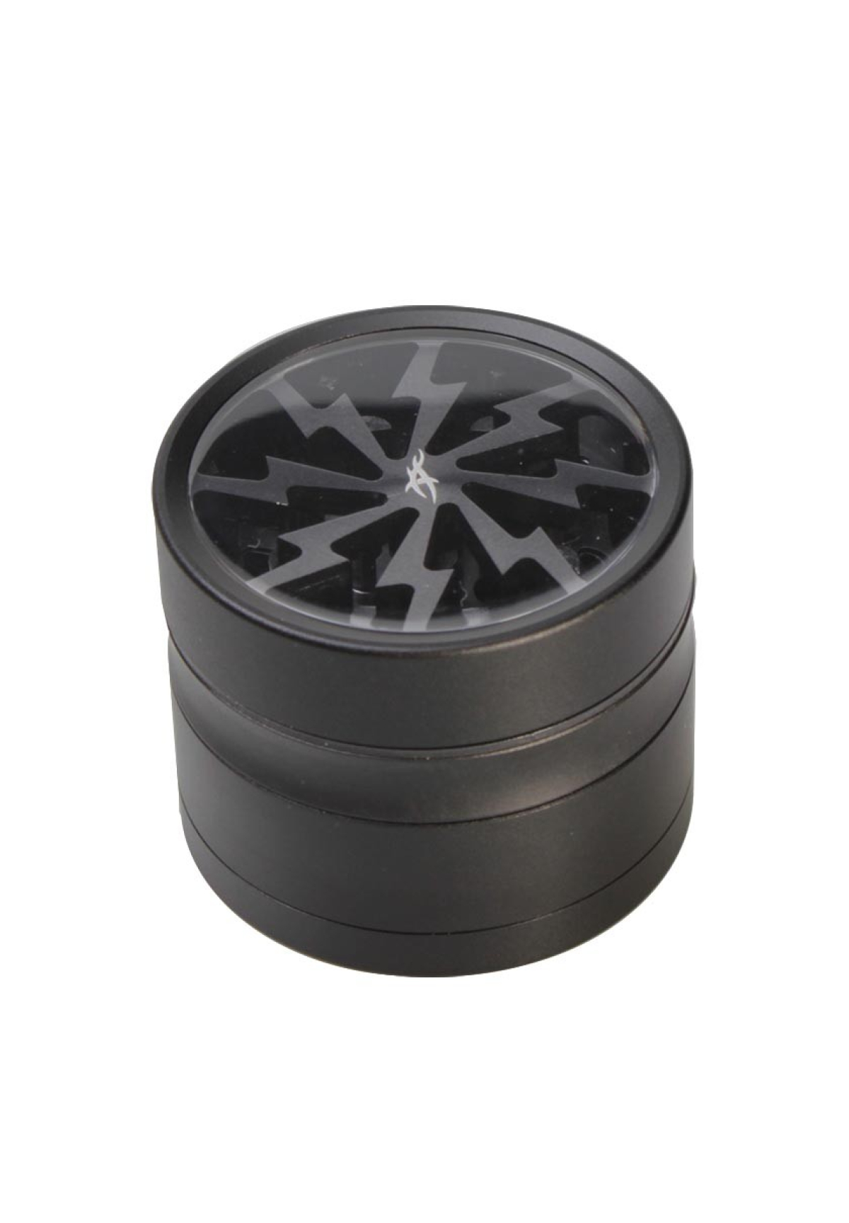 Thorinder par After Grow, grinder 4 parties en aluminium aéronautique anodisé, usiné CNC. Le couvercle transparent avec une fenêtre en verre permet de voir le broyage sans ouvrir. Les ornements en forme d’éclair intègrent les dents de broyage en diamond cut. Fermeture magnétique. Disponible en 50mm (Mini) et 62mm.