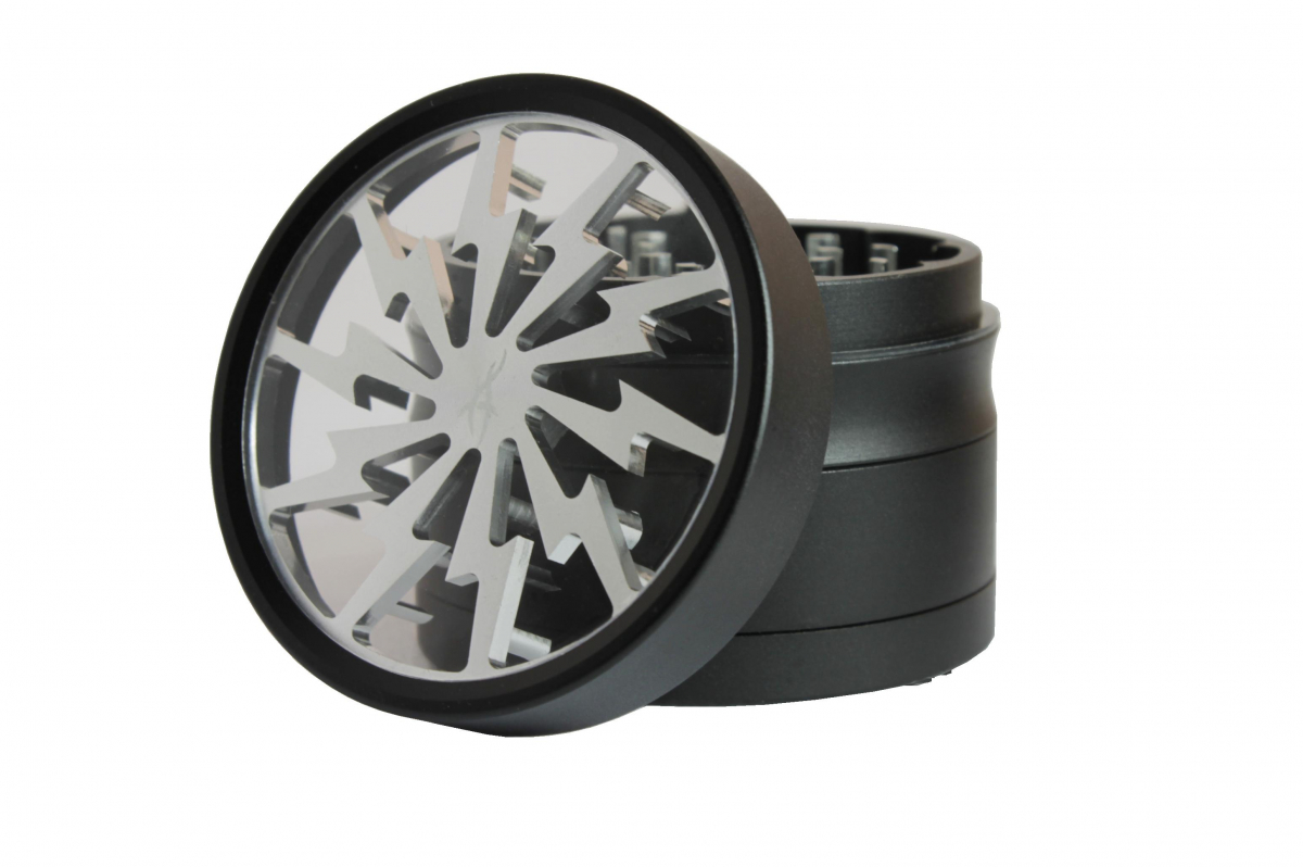 Thorinder par After Grow, grinder 4 parties en aluminium aéronautique anodisé, usiné CNC. Le couvercle transparent avec une fenêtre en verre permet de voir le broyage sans ouvrir. Les ornements en forme d’éclair intègrent les dents de broyage en diamond cut. Fermeture magnétique. Disponible en 50mm (Mini) et 62mm.