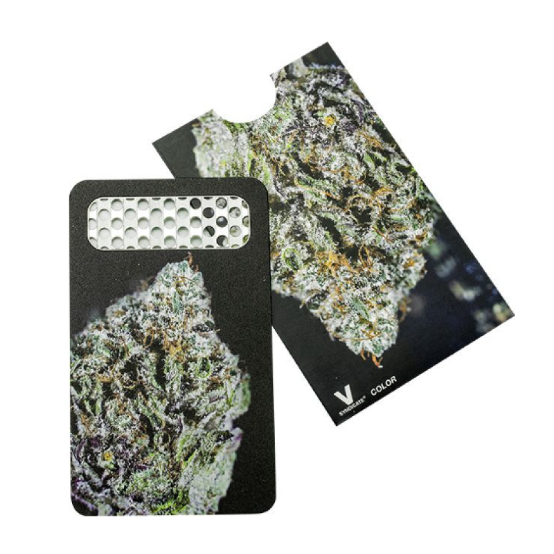 V Syndicate Grinder Card – Booba Kush Bud — grinder card format carte bancaire en acier chirurgical. Se glisse dans le portefeuille.