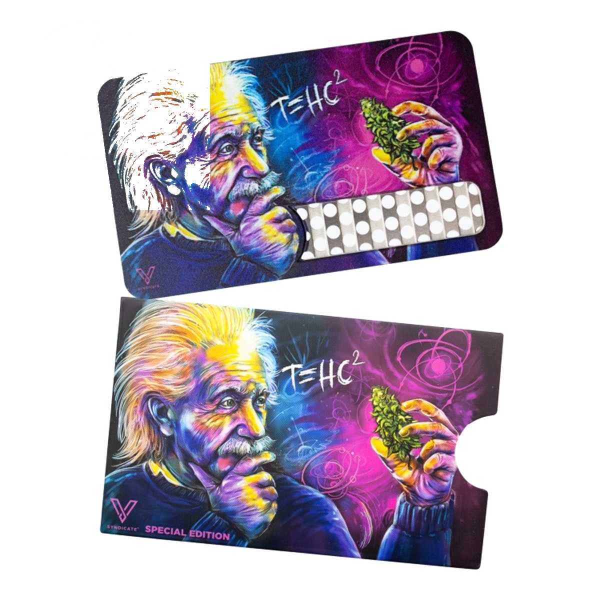 V Syndicate Grinder Card – T=HC2 — grinder card V Syndicate au format carte bancaire (85x50mm). V Syndicate est le créateur de la grinder card originale. En acier chirurgical inoxydable avec revêtement antiadhésif et trous découpés au laser. Les dents sont assez tranchantes pour broyer n’importe quelle herbe mais conçues pour ne pas blesser les doigts. Se glisse dans un portefeuille. Chaque modèle a un design artistique exclusif. Se nettoie d’un coup de chiffon humide.