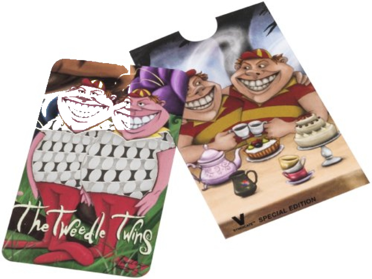 V Syndicate Grinder Card – Tweedle Twins — grinder card V Syndicate au format carte bancaire (85x50mm). V Syndicate est le créateur de la grinder card originale. En acier chirurgical inoxydable avec revêtement antiadhésif et trous découpés au laser. Les dents sont assez tranchantes pour broyer n’importe quelle herbe mais conçues pour ne pas blesser les doigts. Se glisse dans un portefeuille. Chaque modèle a un design artistique exclusif. Se nettoie d’un coup de chiffon humide.
