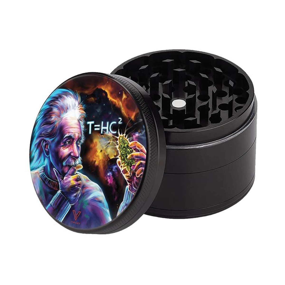 V Syndicate propose aussi des grinders ronds avec revêtement antiadhésif. Les herbes ne collent pas aux parois, ce qui facilite la récupération et le nettoyage. Chaque modèle arbore un design artistique exclusif sérigraphié sur le couvercle. Disponible en format 2 parties (Sharp Shred) et 4 parties (Non-Stick) selon les modèles.