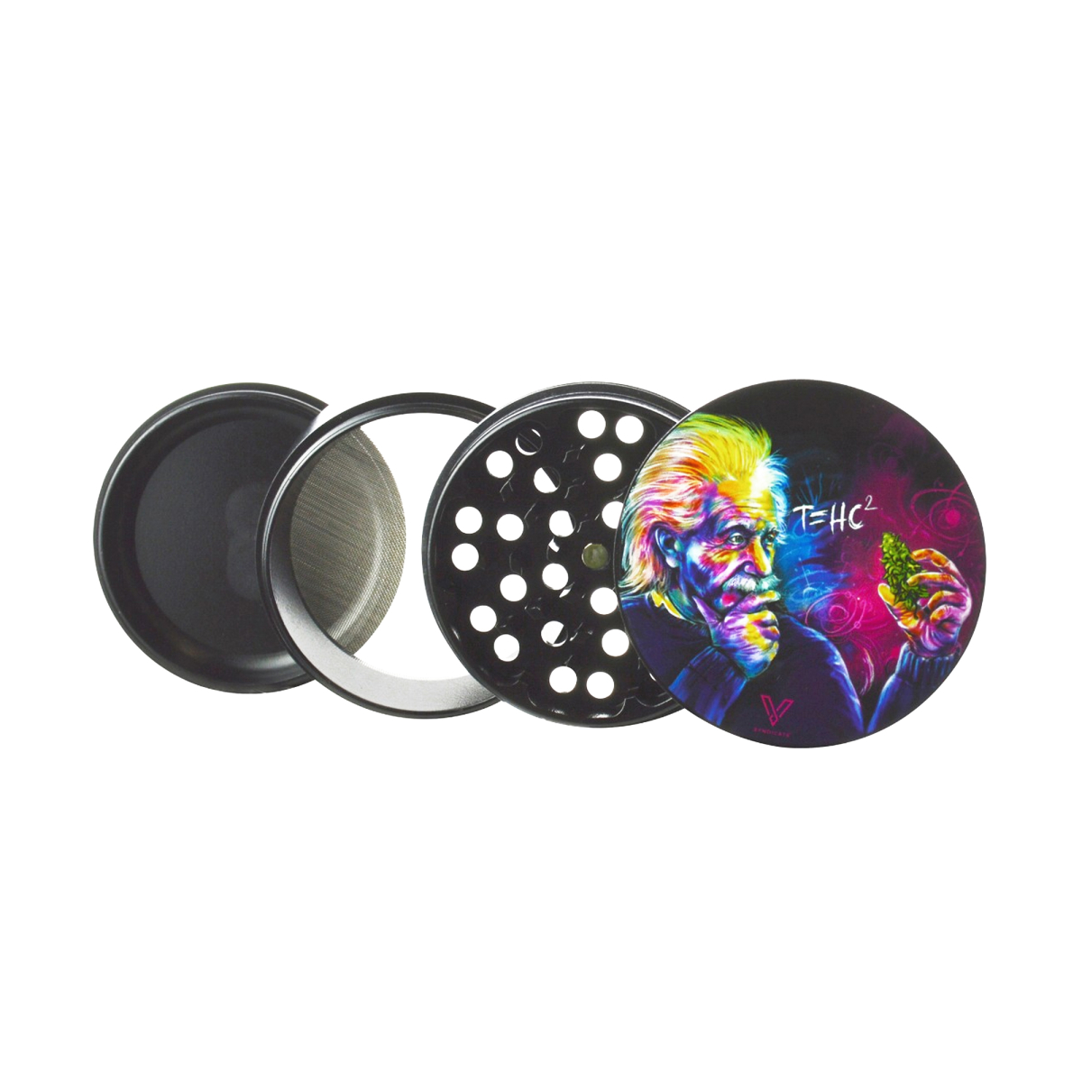 V Syndicate propose aussi des grinders ronds avec revêtement antiadhésif. Les herbes ne collent pas aux parois, ce qui facilite la récupération et le nettoyage. Chaque modèle arbore un design artistique exclusif sérigraphié sur le couvercle. Disponible en format 2 parties (Sharp Shred) et 4 parties (Non-Stick) selon les modèles.